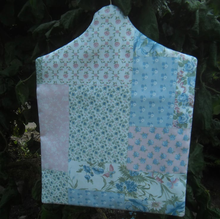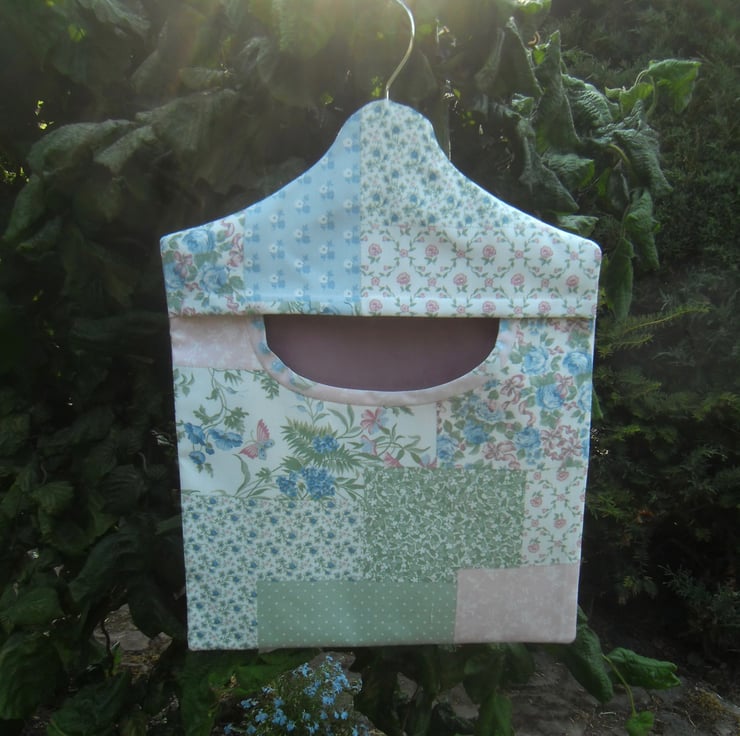 A fully lined peg bag carefully made using a medium weight polyester cotton that has a multi-coloured patchwork print.