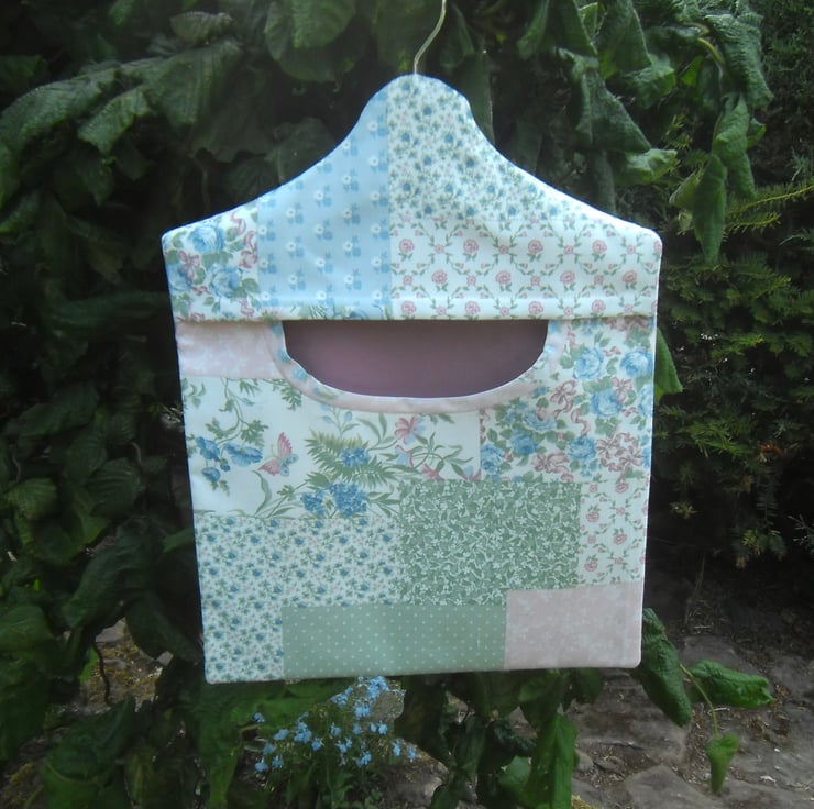 A fully lined peg bag carefully made using a medium weight polyester cotton that has a multi-coloured patchwork print.
