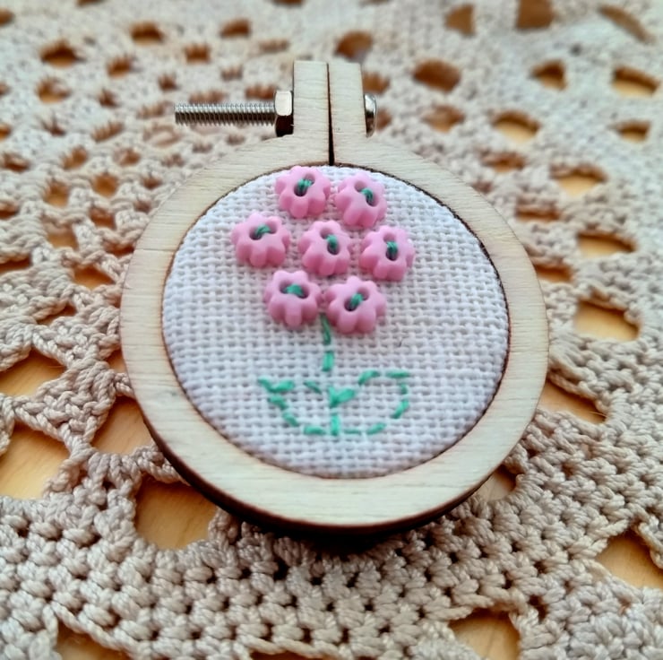 This tiny piece of textile art is a framed in an embroidery hoop with a brooch back. It is a Hydrangea design created with tiny buttons and hand stitching. Each brooch is one of a kind. The brooch is 3 cm diameter.