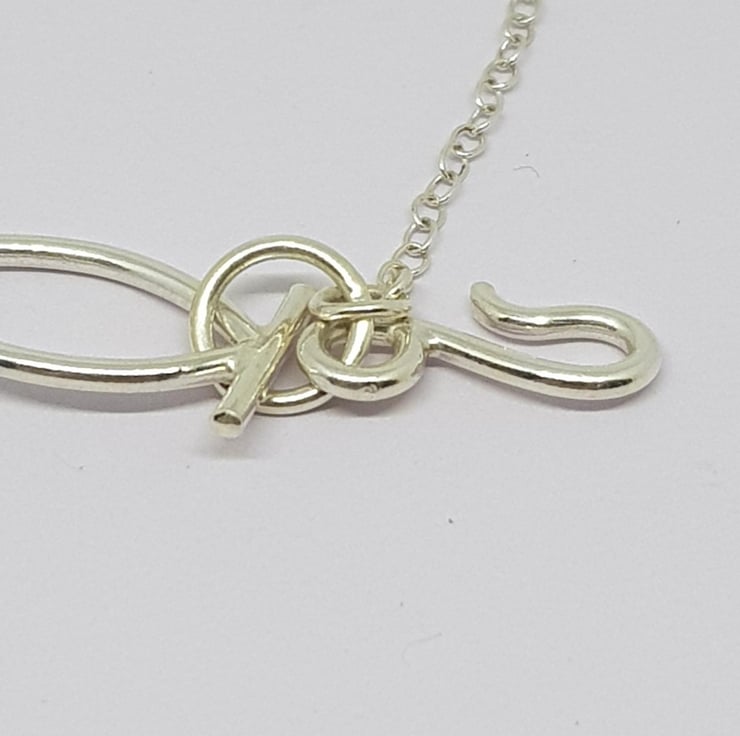Each geometric link is made of 1.5mm round sterling silver wire and measures just under 20 mm. Jump rings are used to connect the links and the bracelet is secured using a handmade hook and ring. A safety chain is fitted to the bracelet.