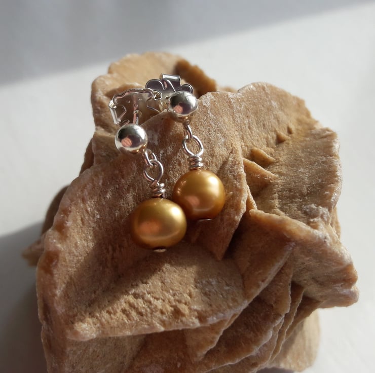 These pearls have a lovely nacre as well as a goregous old gold or coffee colour to them. Ideal for brides, proud mums or bridesmaids. I have a wide variety of colours if you need something in particular to match. The pearls hang 1cm below the post. I've attached them to sterling silver posts, but if you would prefer them on leverback hooks or classic hooks, please include it in the buyers box.
