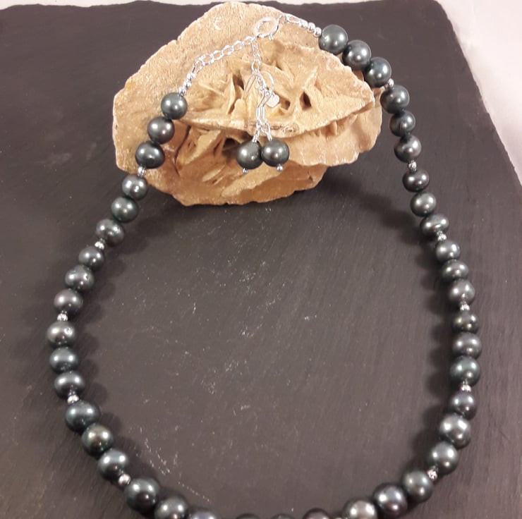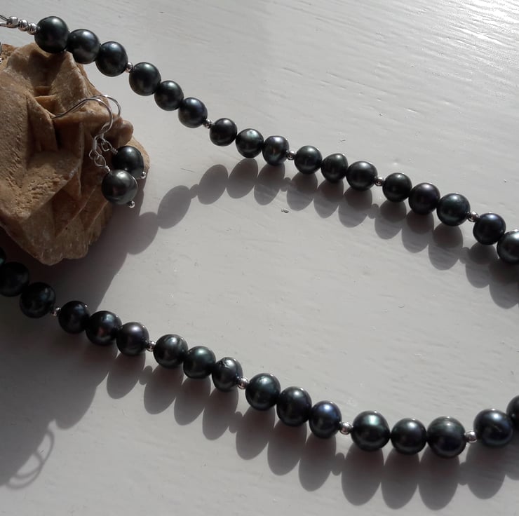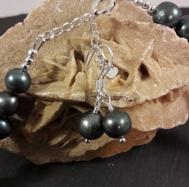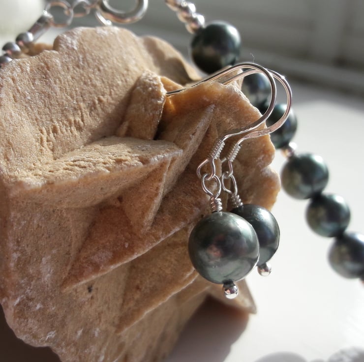 These pearls have a lovely nacre as well as a goregous charcoal grey tone to them. While they are not perfect rounds, they are close and look it, without any lines or ridges on them. They are approximately 1cm in diameter, meaning they took an oyster about 10 years to grow. All of the findings are sterling silver. It is 17in/43cm with a 2in/5cm extender chain. The earrings are a single pearl hanging 1.5cm from a classic hook, but if you would prefer them on leverback hooks or posts, please include it in the buyers box.