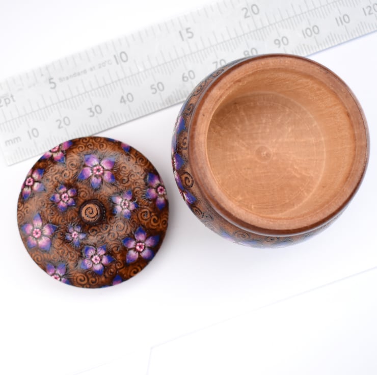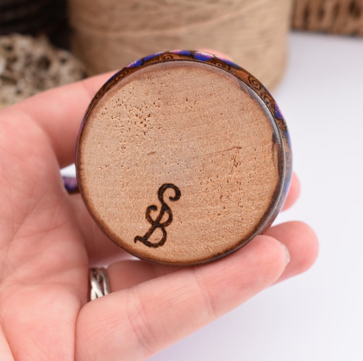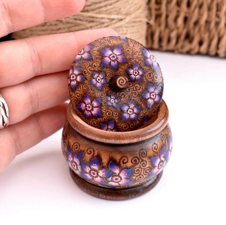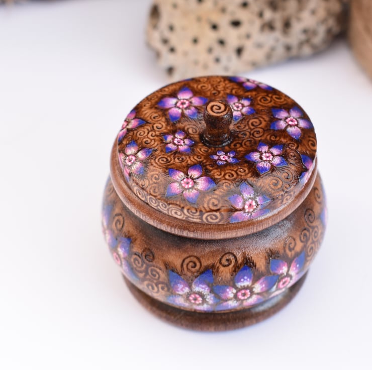 This is a gorgeous and unique mini trinket pot with star shaped flowers hand burned into the wood using pyrography. I’ve coloured the floral highlights in rich shades of purple,blues and pinks, and stained the rim and baseline. It would make a lovely wood anniversary gift (5 years marriage).
