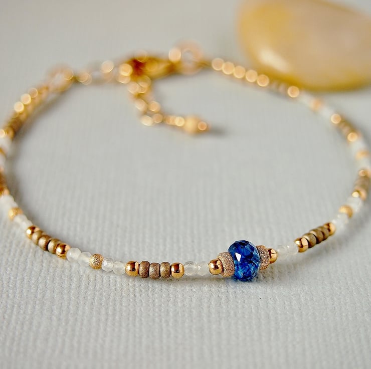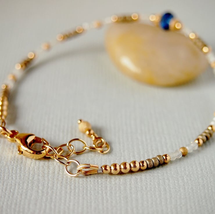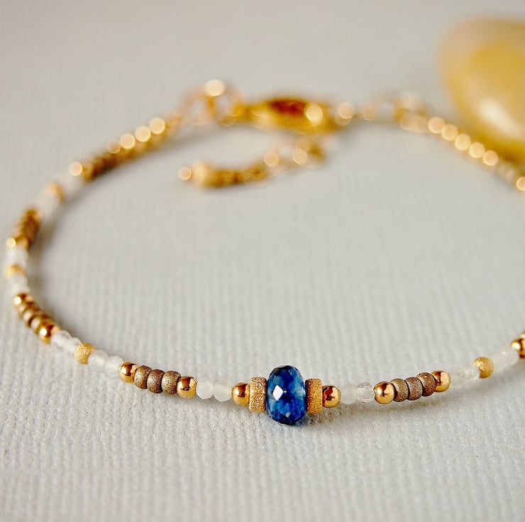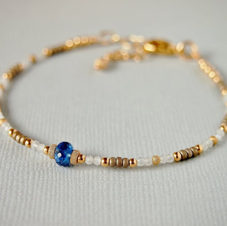 Beautiful gemstone skinny bracelet featuring a central blue Kyanite rondelle surrounded by tiny faceted Moonstone beads complimented by frosted and shiny 14kt gold filled beads interspersed with matte bronze metallic Miyuki seed beads. Delicate design suitable for layering or wearing alone.