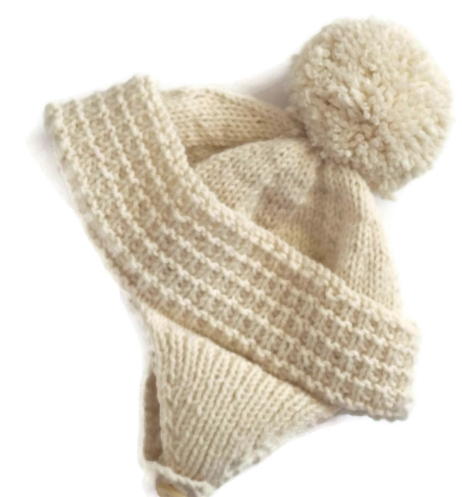 It comes complete with its matching hat which can come with or without the strap and ear covers and its little pom pom
