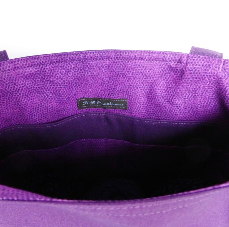 The lining is a quilt weight cotton in shades of purple. Inside there are 2 slip pockets, ideal for you shopping list, phone, keys etc.