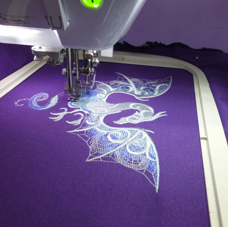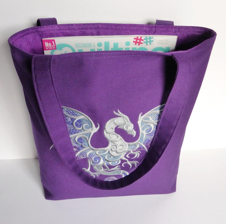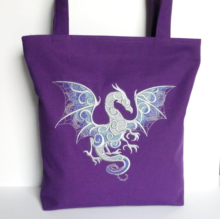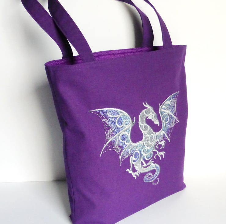 A medium sized strong tote bag made from purple cotton canvas fabric and embroidered with a dragon in shades of silver/grey, purple and green.