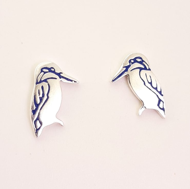 These kingfisher stud earrings are from my wildlife themed jewellery range and have been lovingly handcrafted in North Wales. They are made from sterling silver sheet and are etched before being cut by hand, the edges are then smoothed using files and emery paper before the earrings are carefully given there shape using a punch and hammer. 11mm ear pins are then soldered onto the back. A blue resin based enamel is added to the etched areas and then the kingfishers are polished.