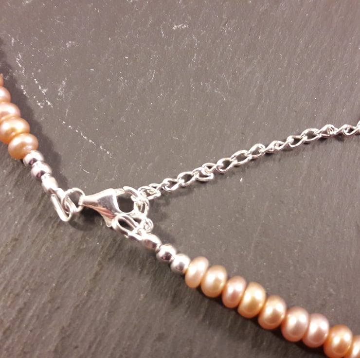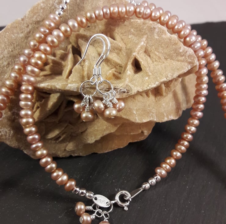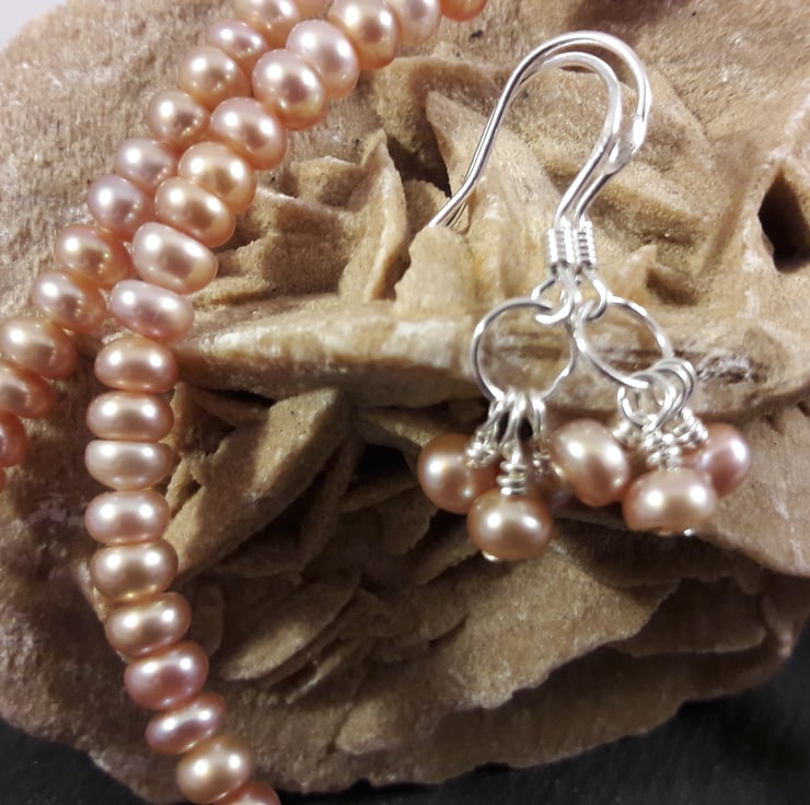These pearls have a lovely nacre as well as a goregous colour. My supplier calls them lilac but they appear peach to me. Ideal for a bridesmaid or proud mother of the bride. They are a cute 5mm in diameter. I've made a three piece set, suitable for any occasion. The necklace is 17.5in/44.5cm with a 2in/5cm extender chain, finished with a pearl. The bracelet is 8in/20cm, with 3 little pearls on a ring, to match the earrings, with dangle 1.5cm from the bottom of the hook. If you would prefer them on leverback hooks or posts, please include it in the buyers box. All of the findings are sterling silver. I have enough for another set, should you require 2 sets.