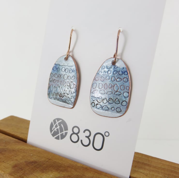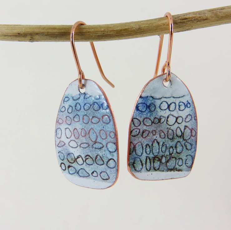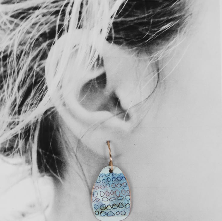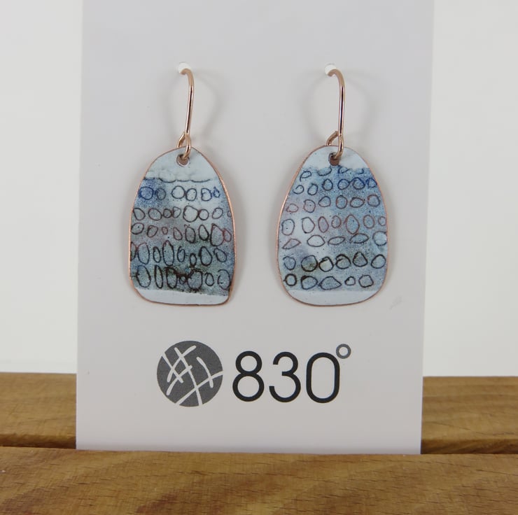 These unique dangle earrings are hand cut from copper. They measure 25mm long by 15mm wide. I have applied several layers of enamel, drawing through each layer to create the patter. They have been fired in a kiln at 830 degrees. They hang on rose gold plated wires. Both earrings have subtle differences as it is impossible to create an identical pair but that adds to their handmade charm.