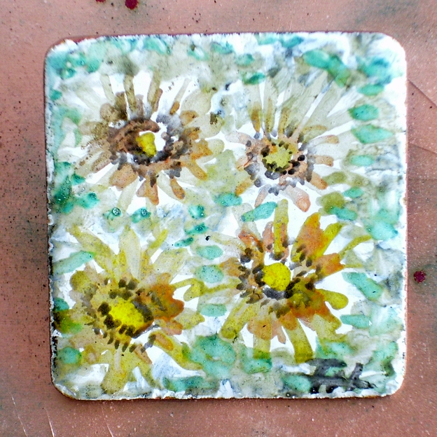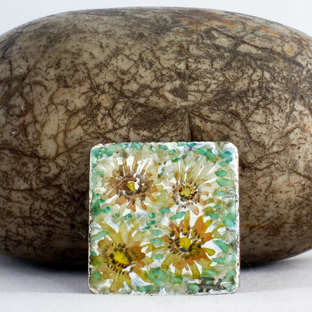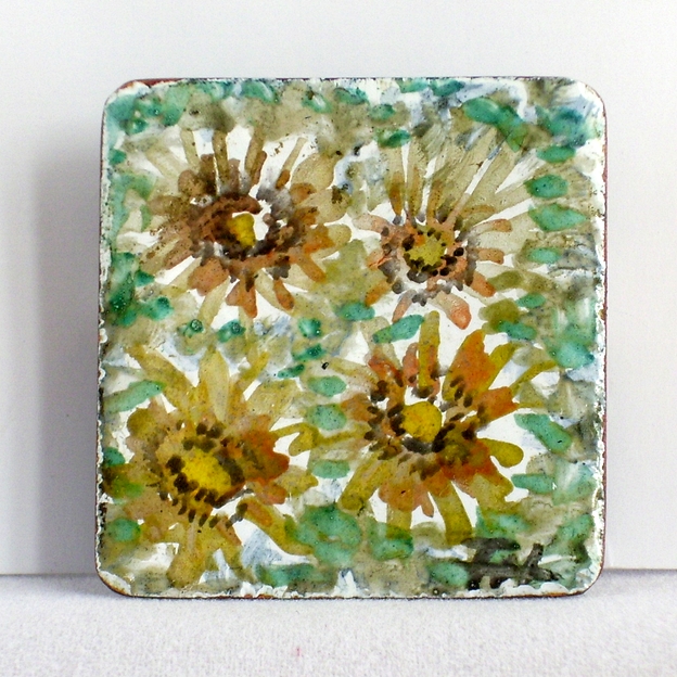 This is a watercolour I have painted on a white enamel background I built on the copper square. I use tablets of colours in which the pigment is finely ground enamel powder. When I have completed the picture I fire the piece as I do any other enamel. The picture is signed with my initials 'FH' in the bottom right corner.