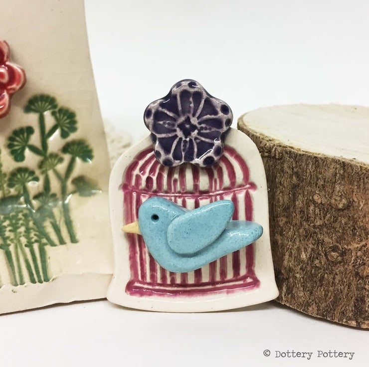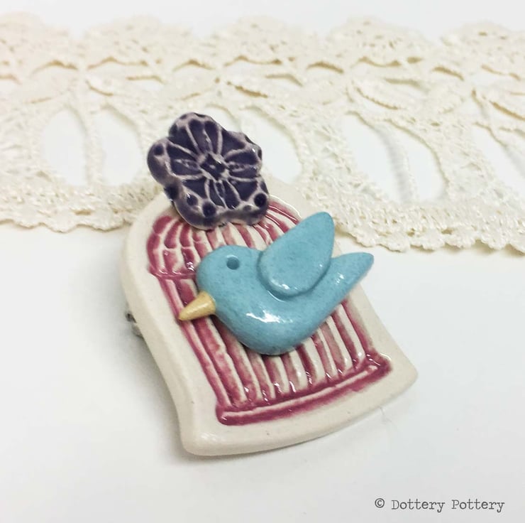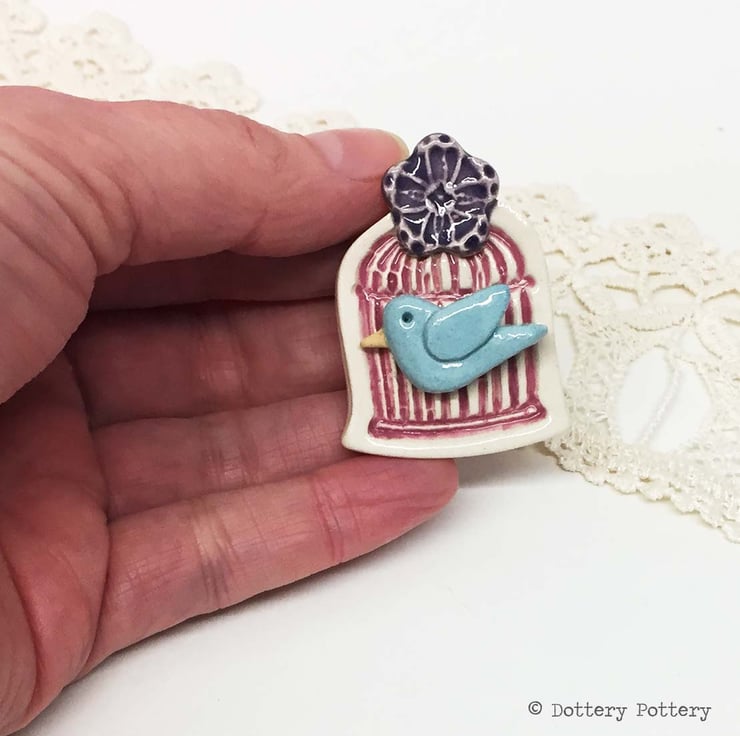 This cute little bird cage brooch is made from white earthenware clay and twice fired to a top temperature of 1100 degrees.
