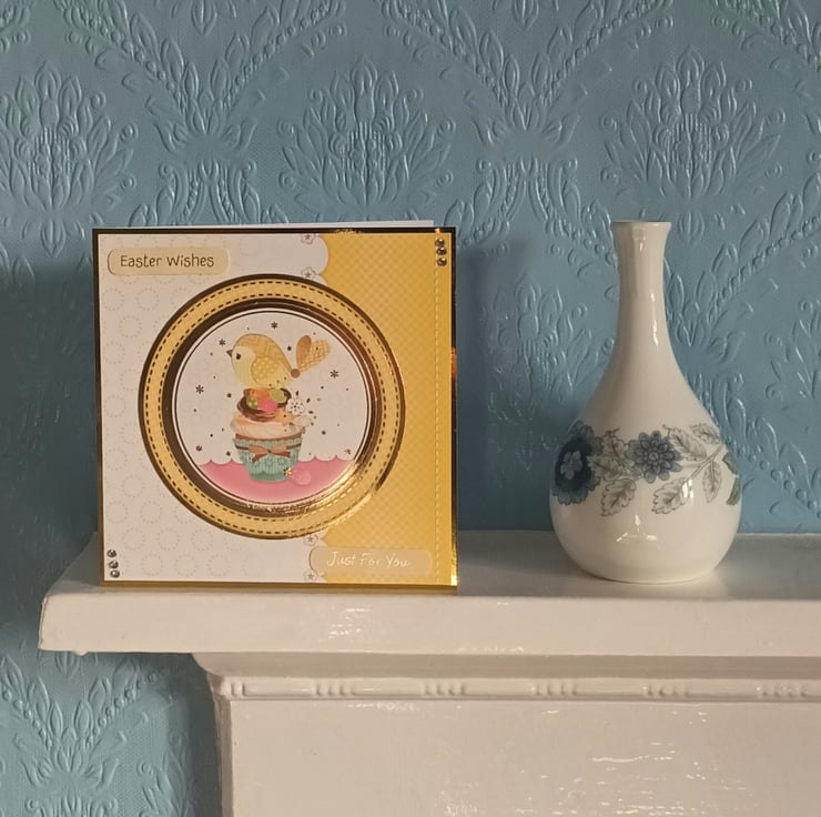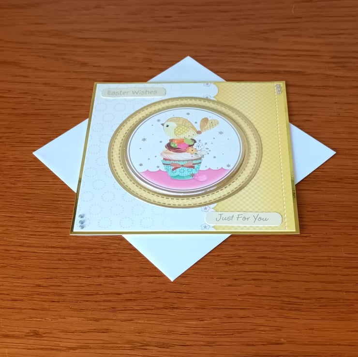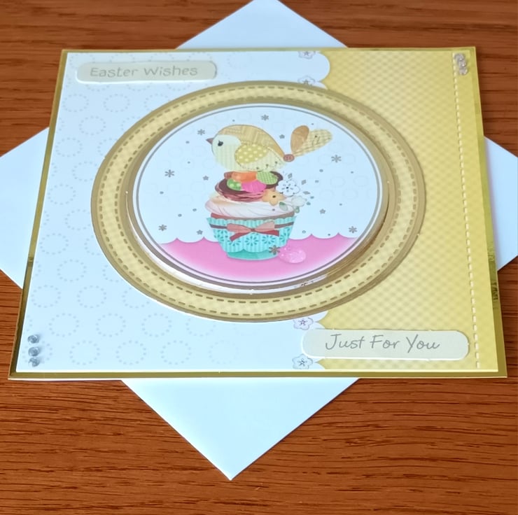 A pretty card featuring a cup cake, a little bird and Easter eggs and the sentiment “Easter Wishes” and “Just For You”.