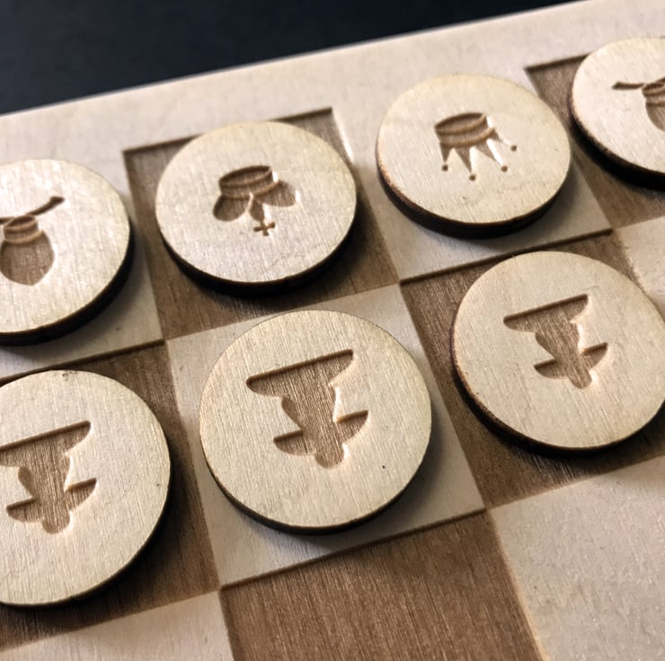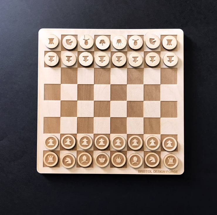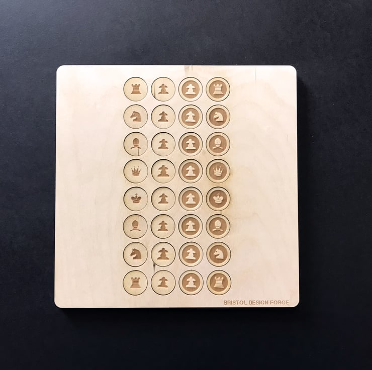 This minimal chess set has been laser cut out of 3 or 4mm birch ply and hand-sanded finished. The board is 250mm square and the pieces are 25mm in diameter. It comes packaged in minimal packaging and the pieces come with their own simple storage on the reverse of the board so you never have to lose them.