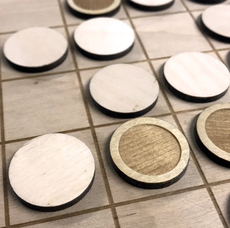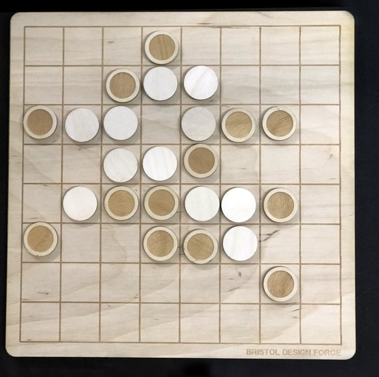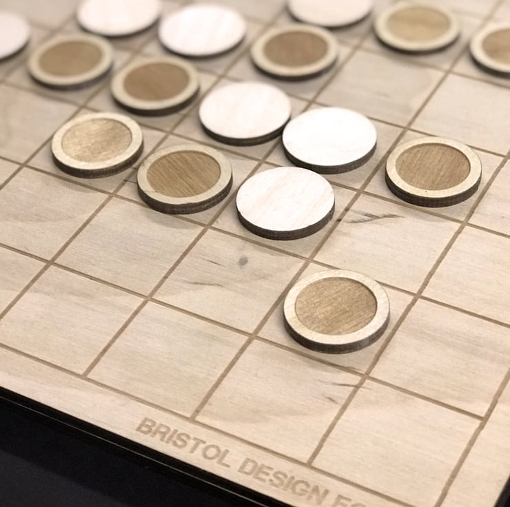 This minimal reversi board has been laser cut out of 3 or 4mm birch ply and hand-sanded finished. The board is 250mm square and the pieces are 25mm in diameter. It comes packaged in minimal packaging and the pieces come with their own simple storage on the reverse of the board so you never have to lose them. It can also be used to play Othello.