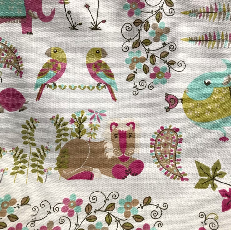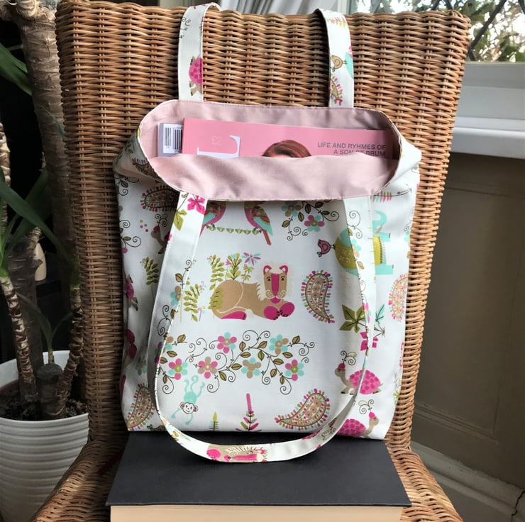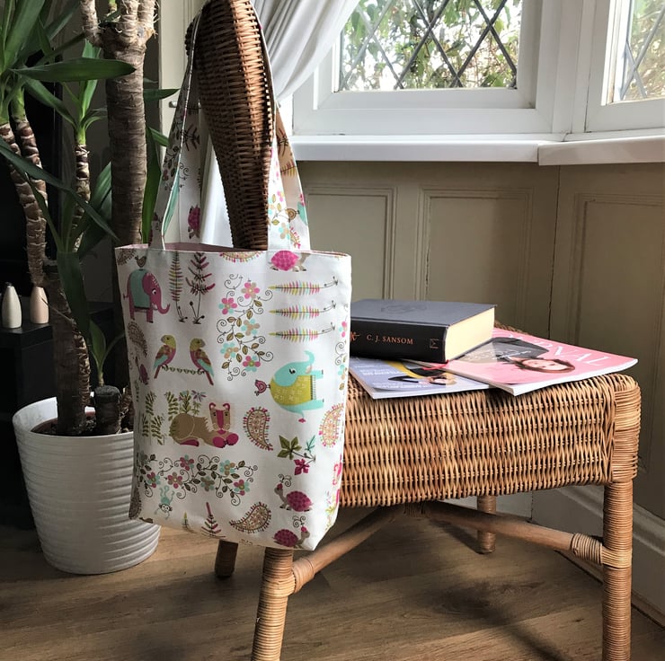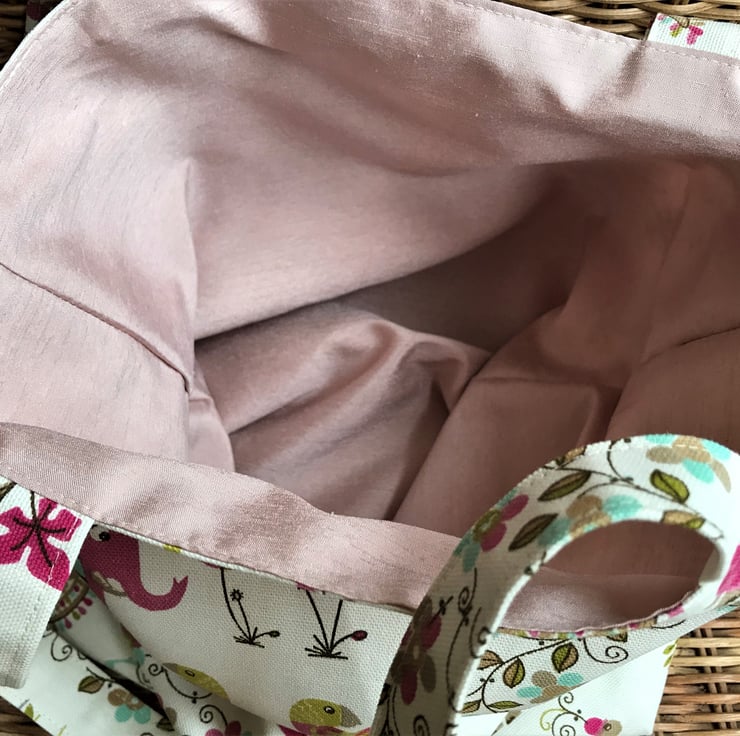 A lovely tote bag in cream fabric with a tropical print pattern featuring elephants, lions, parrots, tortoises and monkeys as well as flowers and foliage. The colours are bright and zesty shades, including pink, turquoise and lime. The bag is lined with pale dusky pink fabric.
