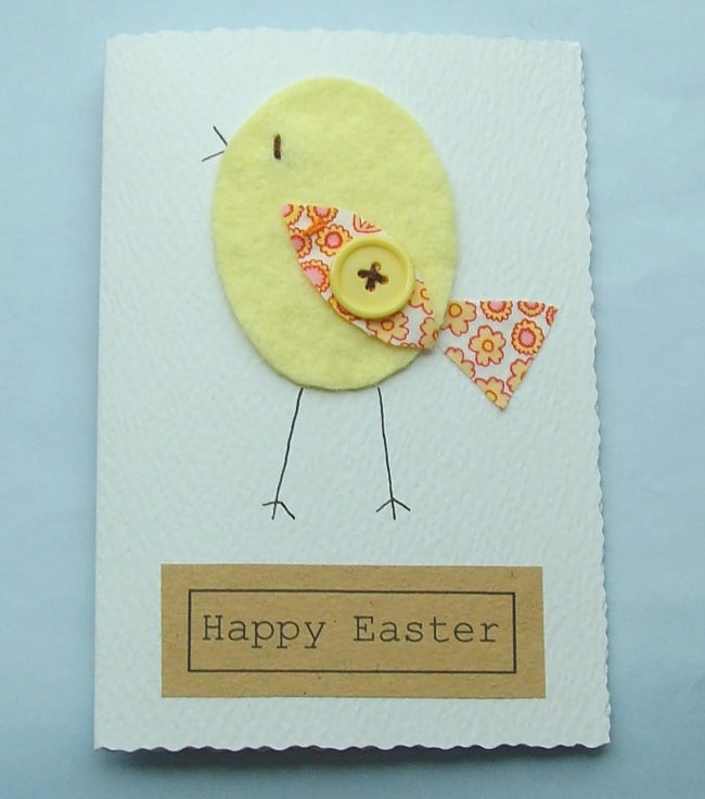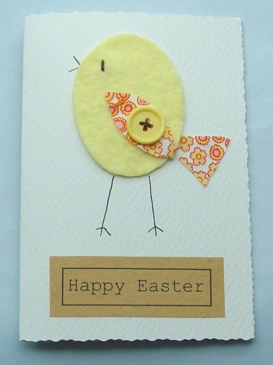 This card is all hand cut from an original design. The chick is made from felt with a hand stitched eye and a wing made from cotton fabric. The wing has a hand stitched vintage button. The chick is finished of a hand drawn beak and legs.