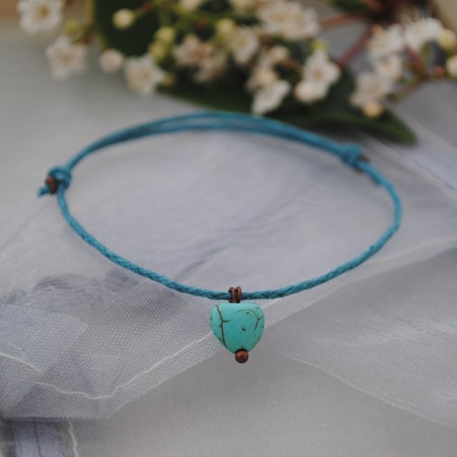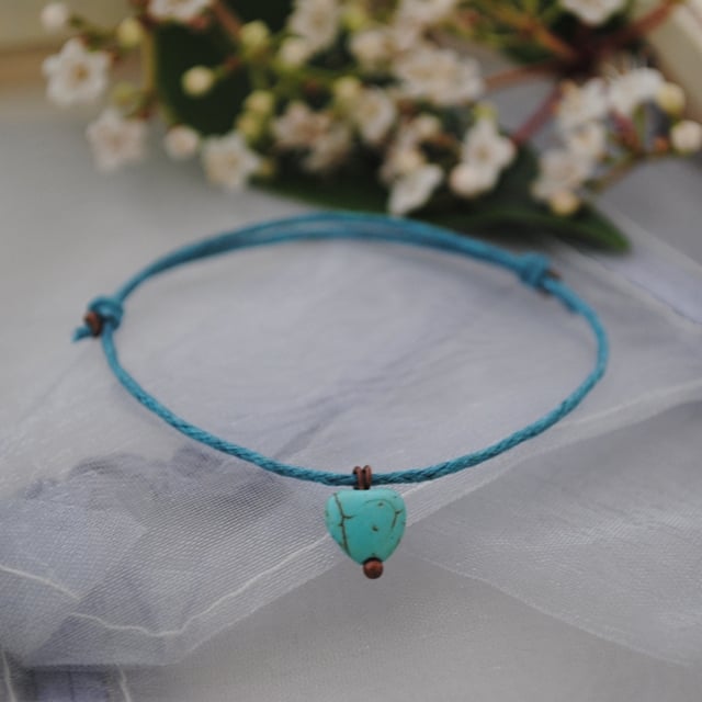 Semi-precious howlite friendship bracelet. This bracelet is made with a natural howlite stone heart which is dyed turquoise and waxed turquoise cotton cord.
