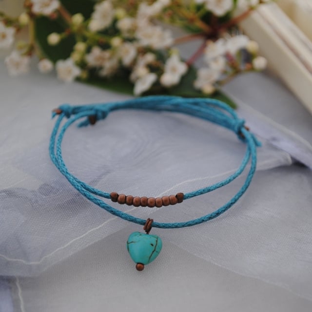 Set of 2 friendship bracelets - 1) Semi-precious howlite friendship bracelet. This bracelet is made with a natural howlite stone heart which is dyed turquoise and waxed turquoise cotton cord. 2) Turquoise waxed cotton with small antique copper beads.