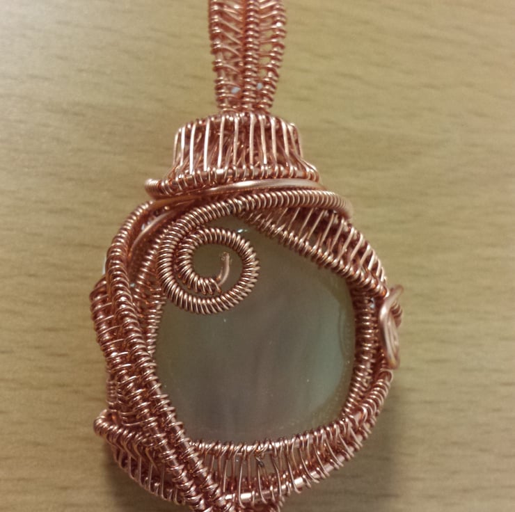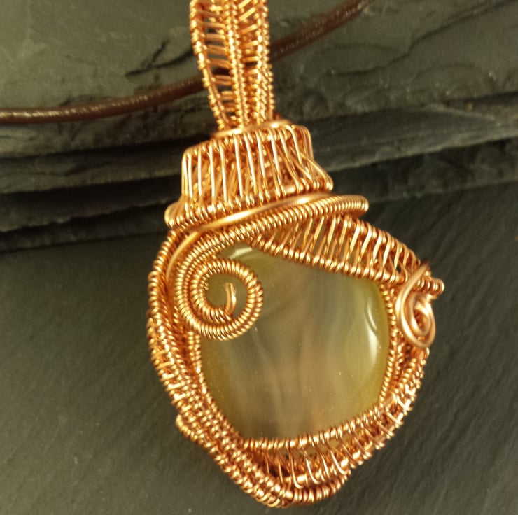 A smokey beige onyx oval shaped cabochon, 3.5 cm, has been wrapped using coated copper wire. It is a high complexity design, each is priced to reflect the time taken to create them. The total pendant is about 6cm. The bale is generous enough to take a variety of necklaces. Suitable matching wire torque and viking knit chain in the same wire will be available soon from my shop. Would look great even on ribbon/cord/leather.