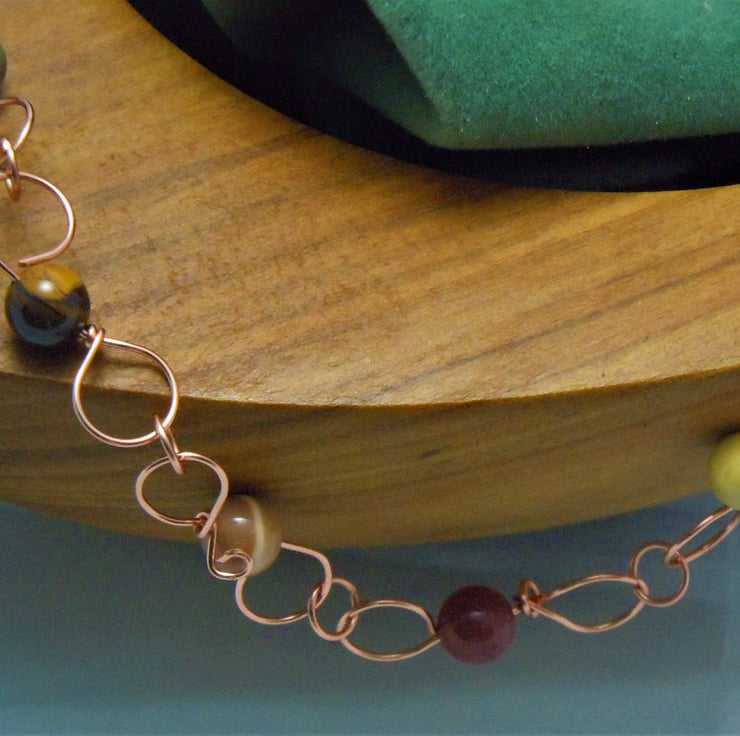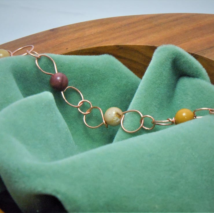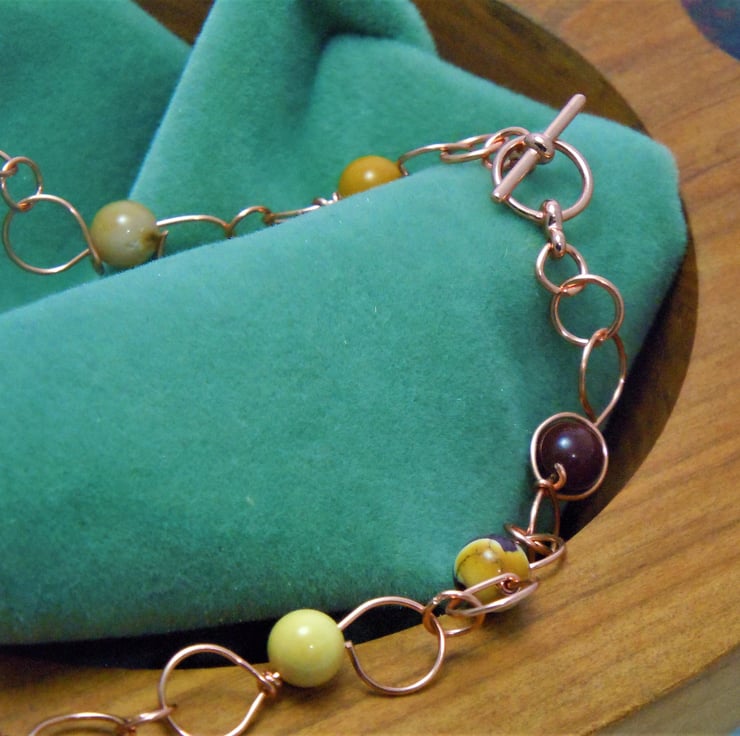 Handcrafted copper wire S links interspersed with a selection of Mookaite beads in yellows, creams burgundy & pinks finished with a copper toggle clasp.