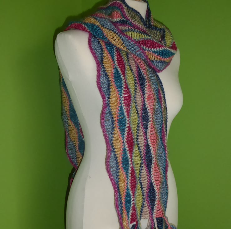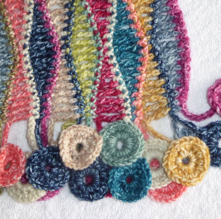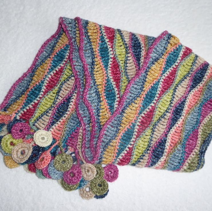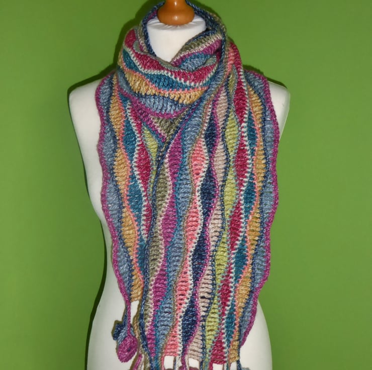 I have crocheted this beautiful scarf from a double knitting weight premium wool and acrylic blend yarn. It is 20% wool and 80% premium acrylic and is wonderfully soft. There are circle tassels at either end.