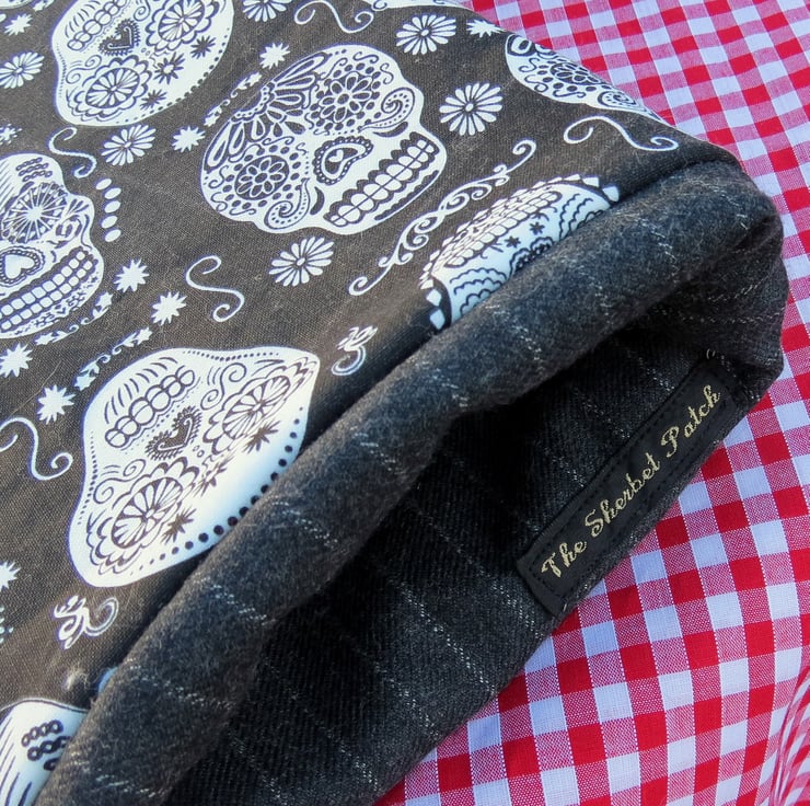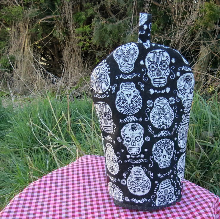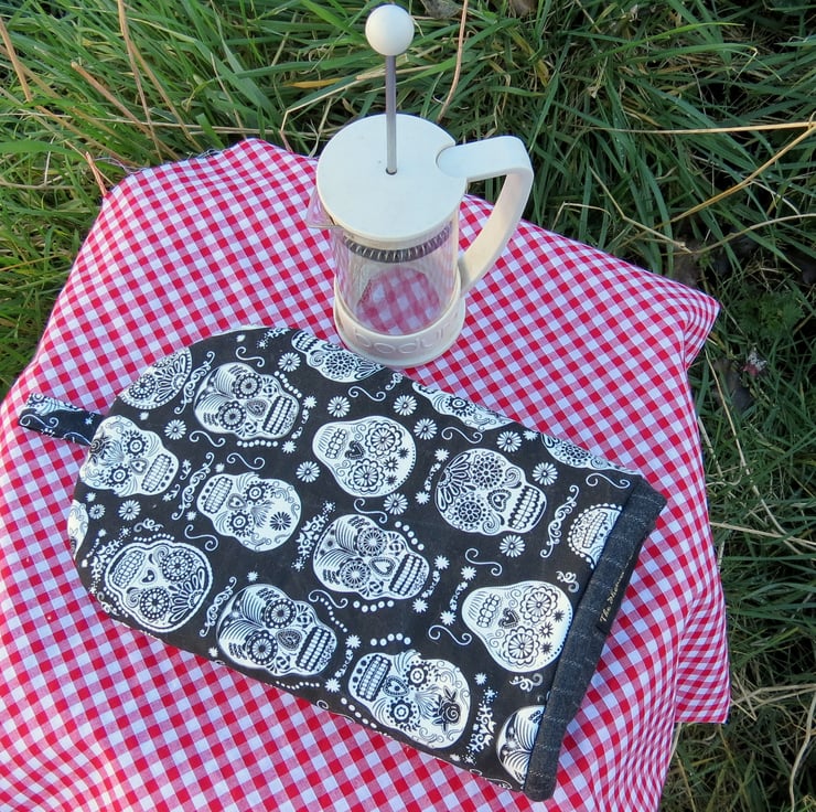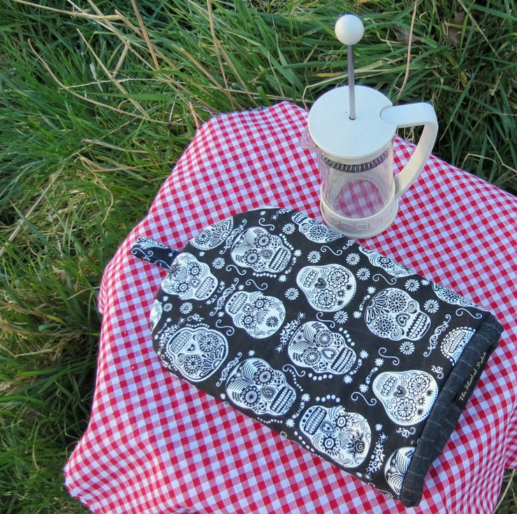 This cafetiere cosy is made from a medium weight cotton, with a skulls design.