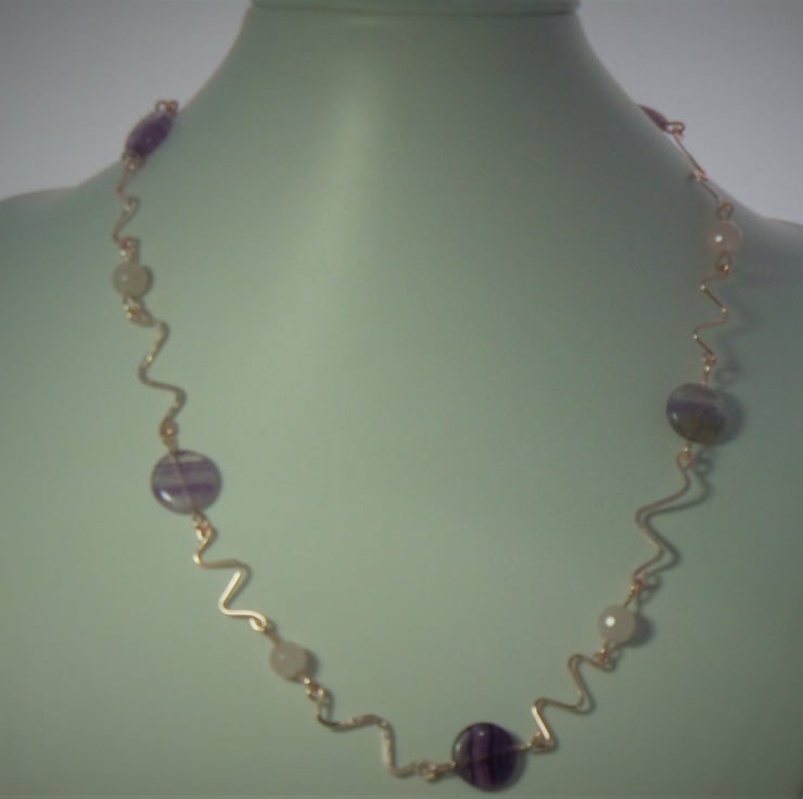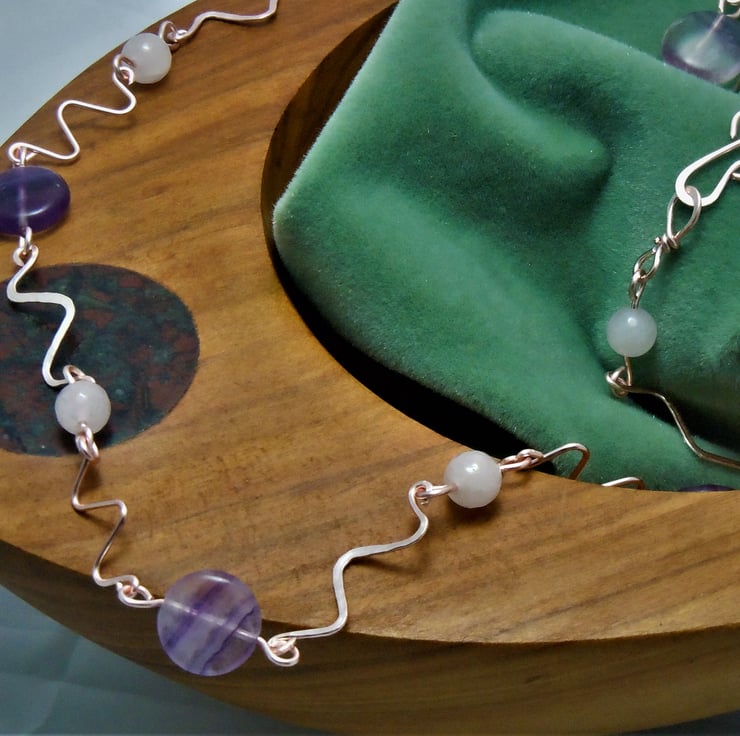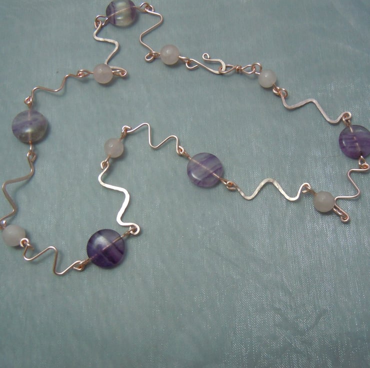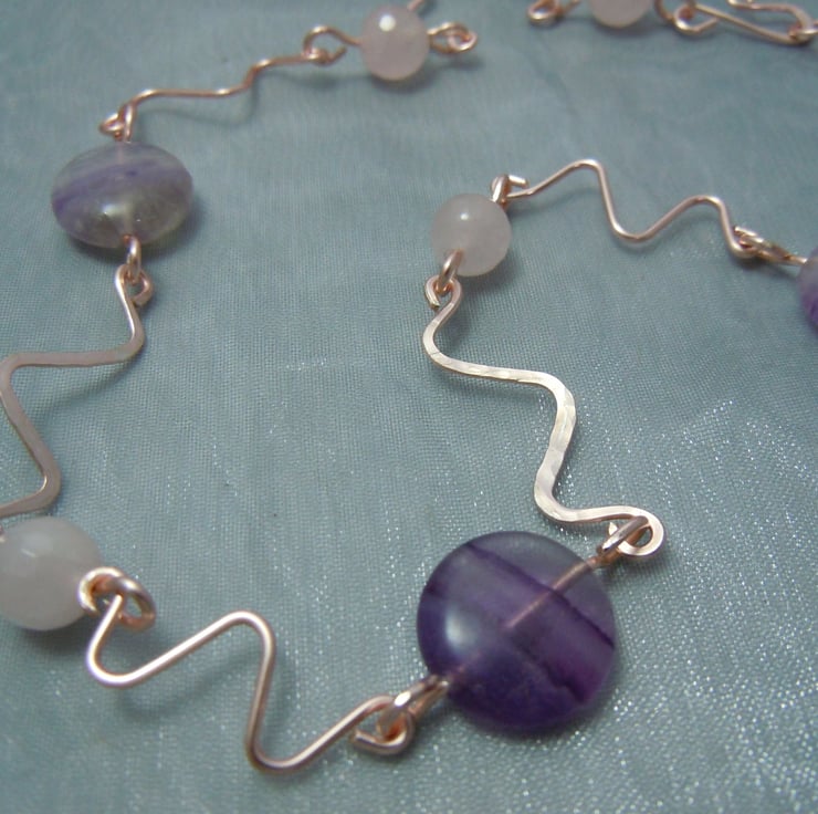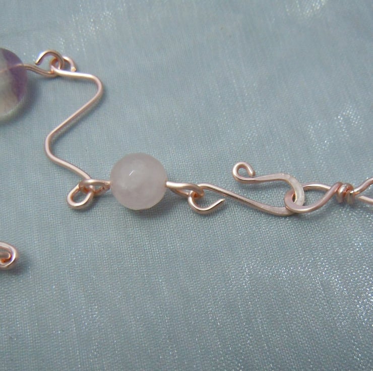 Handcrafted hammered rose gold coloured copper wire in wavy shaped links which are interspersed with purple fluorite & faceted Rose Quartz beads finished with a handmade fish hook clasp.