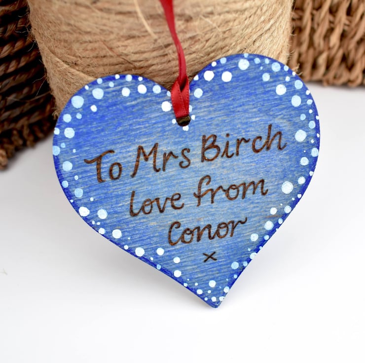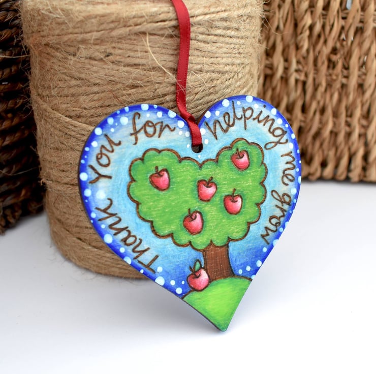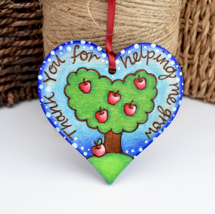 One apple tree heart reading 'Thank you for helping me grow' would make an ideal gift for a teacher, classroom assistant, tutor, childminder or grandparent. Hand burned using pyrography and coloured using vibrant blended prismacolor pencils.