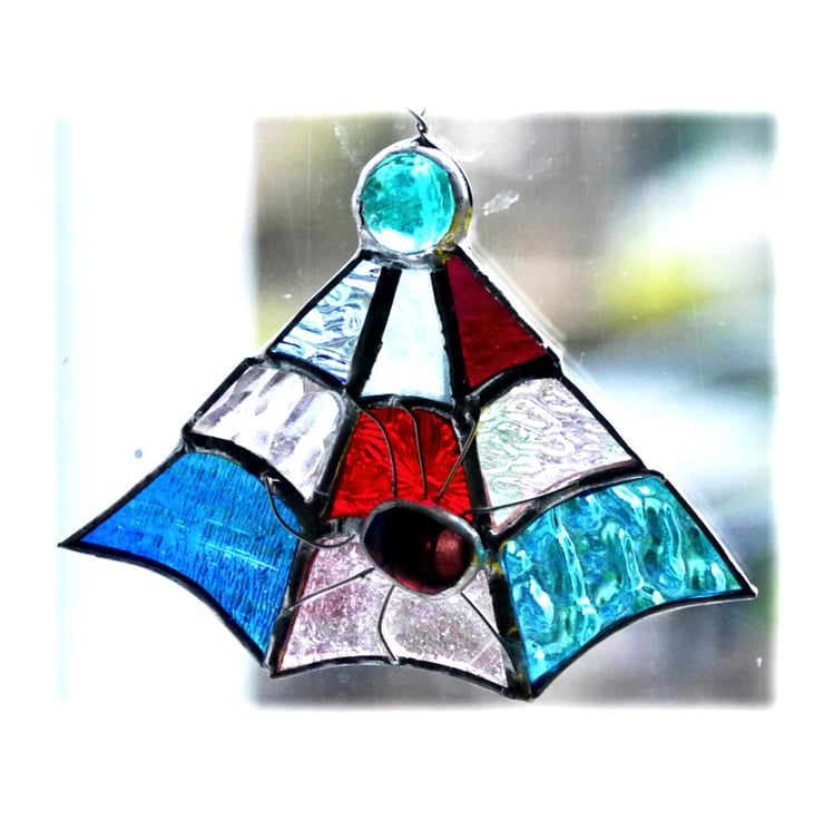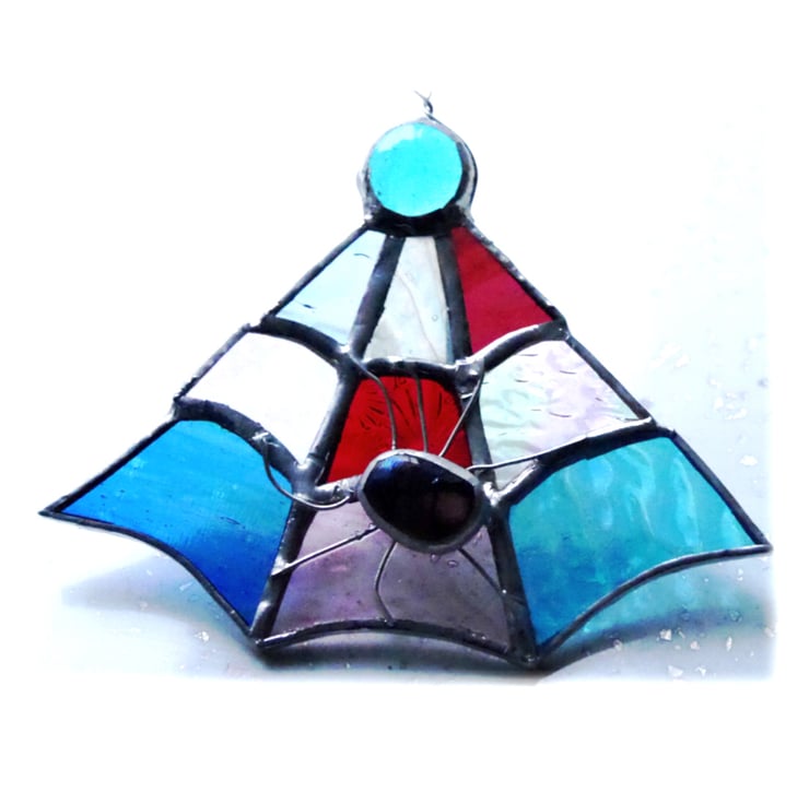 All 9 sections oft the web are different types of glass, some red, turquoise, clear iridescent and generally a rather lovely combination of colour.