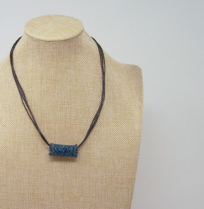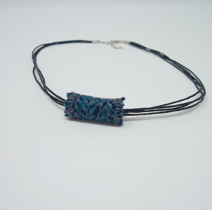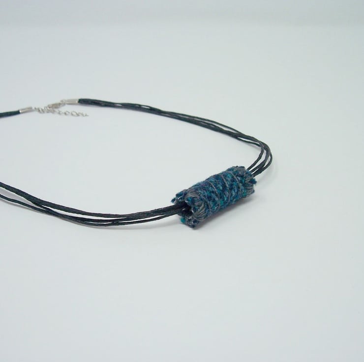 Single, chunky handmade Harris tweed fabric bead, threaded onto a multi strand, black waxed cotton cord. Fastener is a silver coloured metal lobster claw.