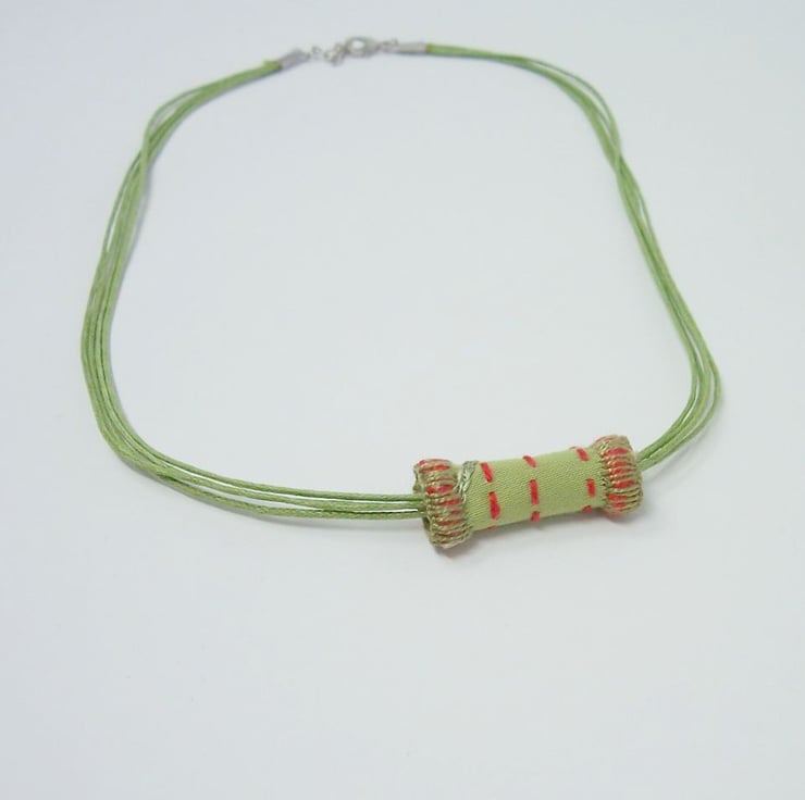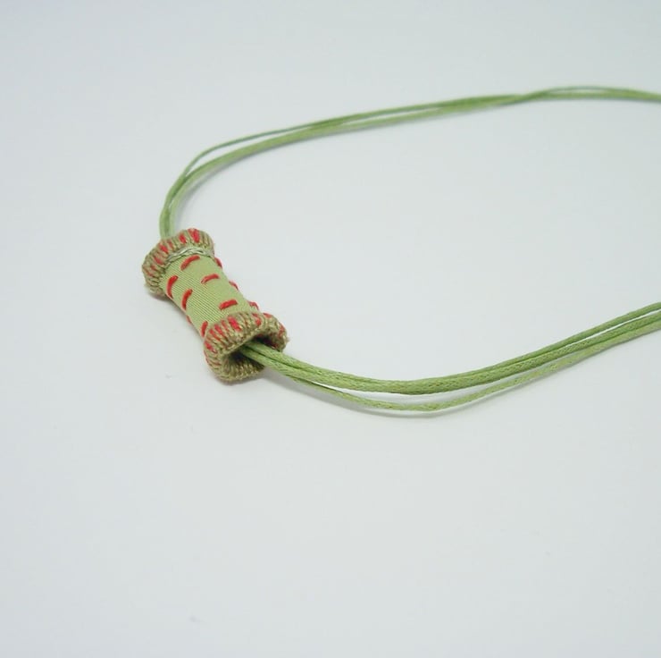 Handmade fabric bead - hand stitched and embroidered fabric bead. Bead is made from a lime green fabric with co-ordinating chain stitch, that has been hand embroidered in scarlet thread for contrast. The ends of the bead has been finished with hand stitching in green and red.