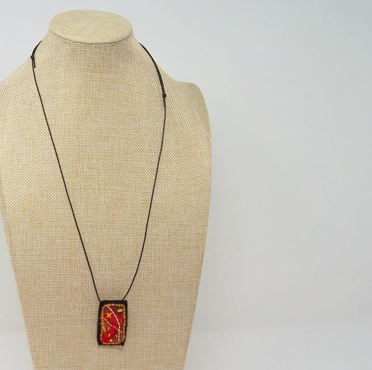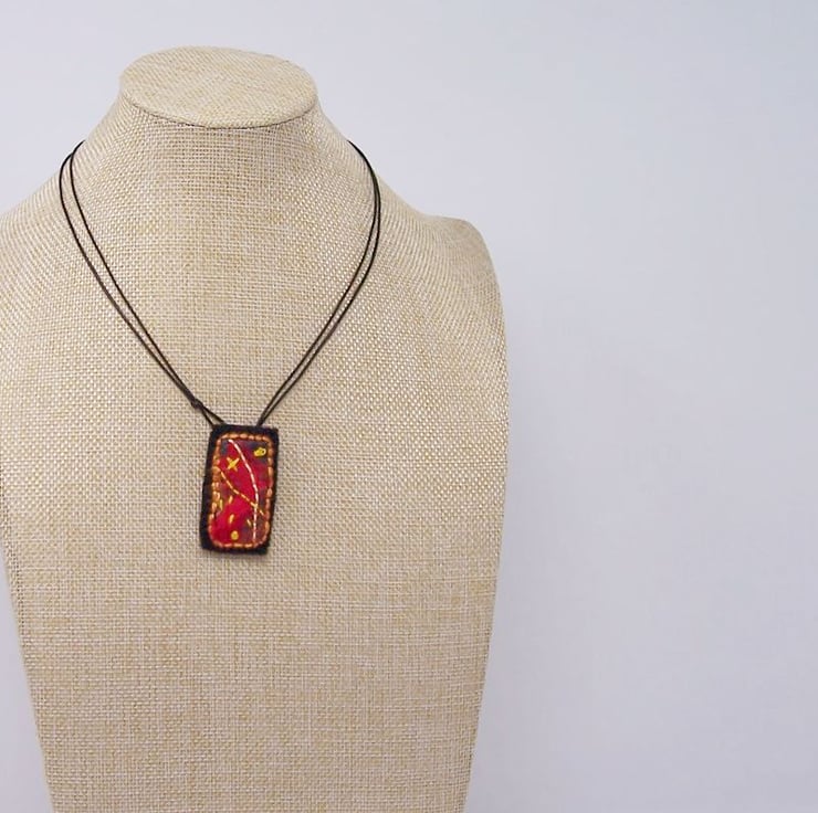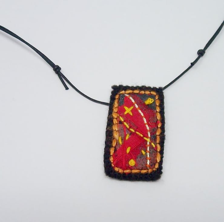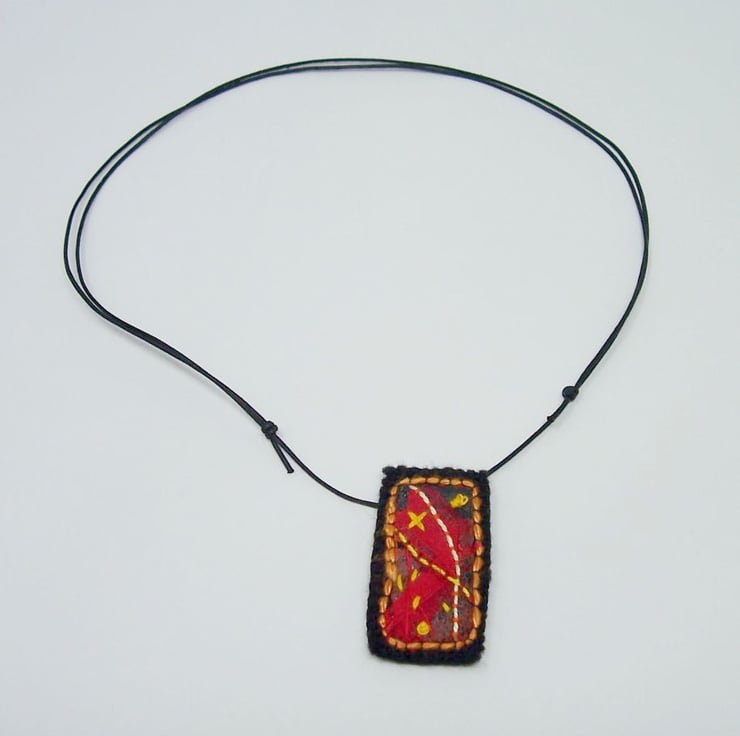 Flame textile pendant with hand embroidery. One of a kind item. Pendant is made from silk fabric and fibres on a felt backing, then hand embroidery in various yellow and red threads.