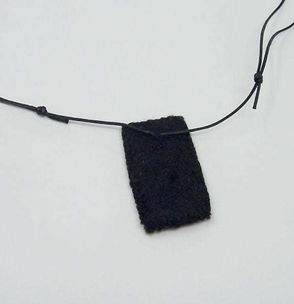 Wool felt backing, stitched onto a black waxed cotton cord with a slip knot fastening - this simply slips over the head and you then shorten it to your preferred length.