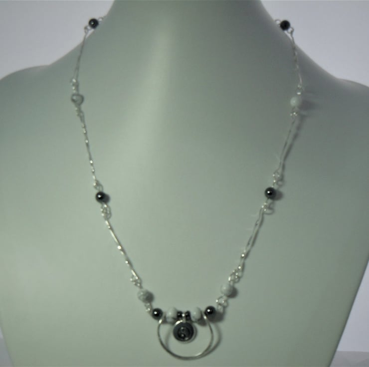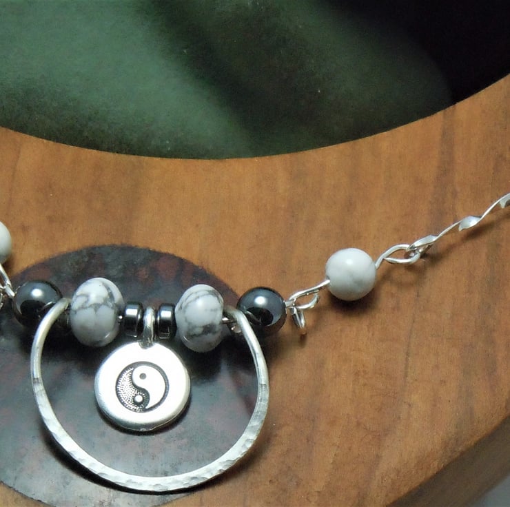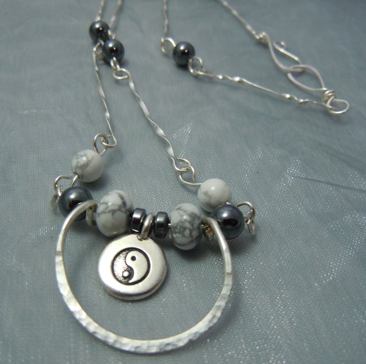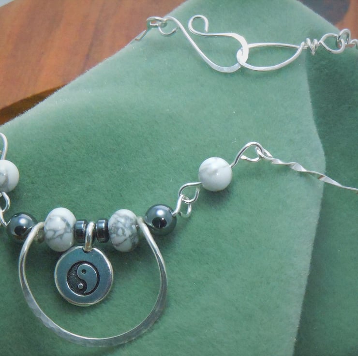 A unique necklace with handcrafted hammered & twisted silver plate wire links interspersed with Hematite & Howlite beads with a hammered silver plate scallop shape focus pendant & a TierraCast Yin/Yang charm & finished with a handcrafted fish hook clasp.