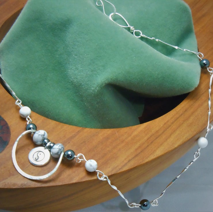 A unique necklace with handcrafted hammered & twisted silver plate wire links interspersed with Hematite & Howlite beads with a hammered silver plate scallop shape focus pendant & a TierraCast Yin/Yang charm & finished with a handcrafted fish hook clasp.