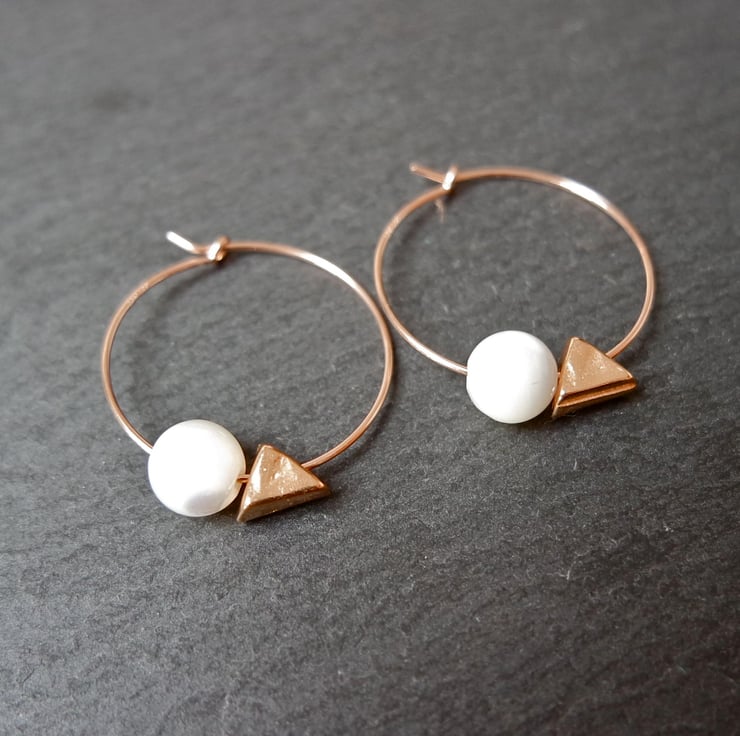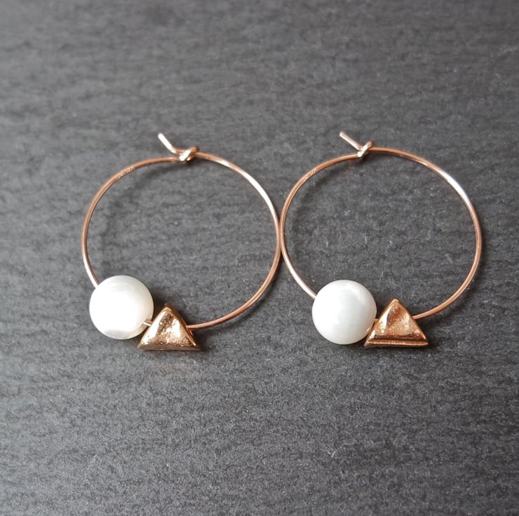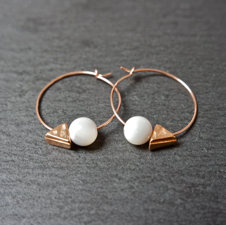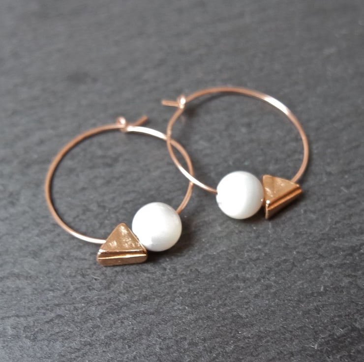 Rose gold filled hoops with small rose gold plated triangle beads and white, iridescent mother of pearl beads.