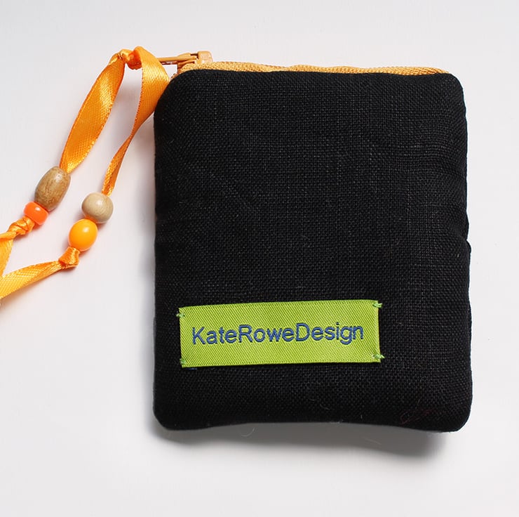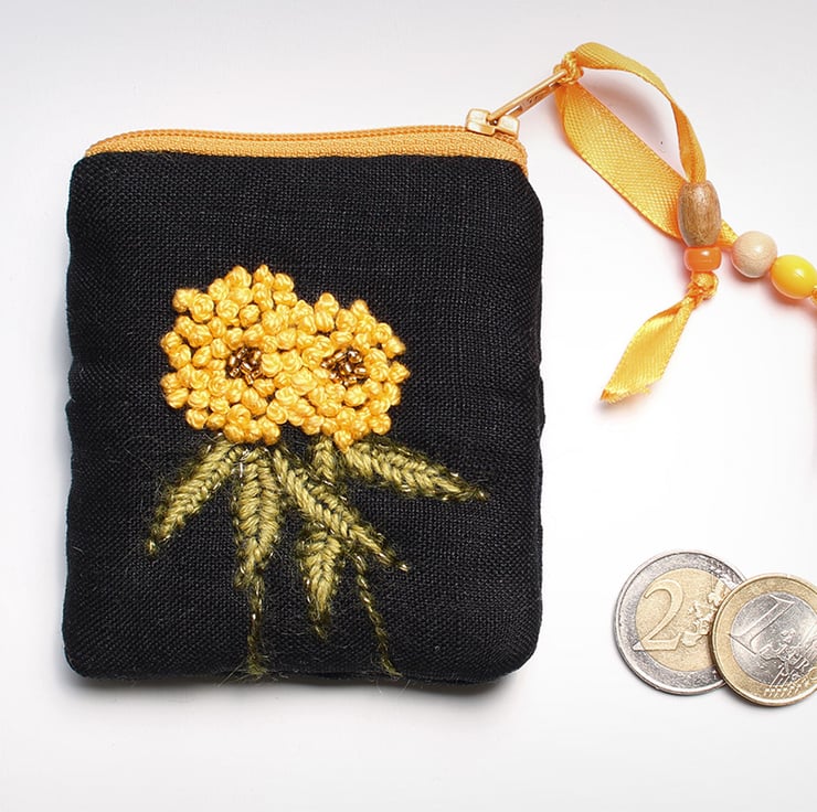 This little coin purse (3.5" by 3.5"/7cm by 7cm) has been made in black linen fabric and has a yellow clover hand embroidered on the front. The purse is fully lined and has a yellow zip and a yellow ribbon and bead zip pull. The purse is perfect for a little treat or gift.