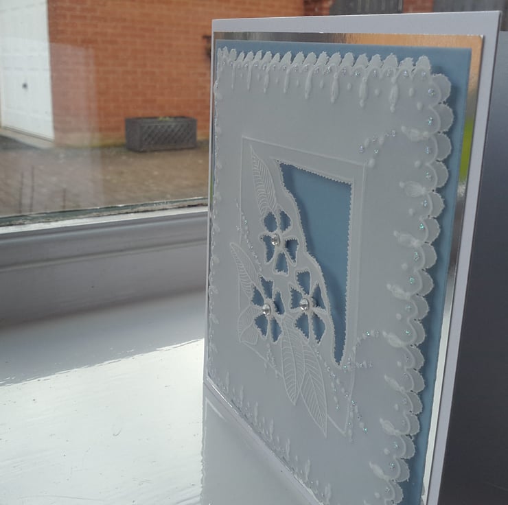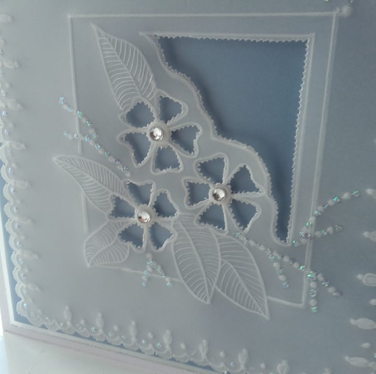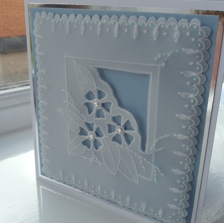 A completely handmade and uniquely designed card. Consisting of parchment which has been embossed and cut into a very pretty flowery design. It has a very delicate scalloped edging and has been finished off with holographic fine glitter and silver rhinestones. Mounted onto Wedgewood blue vellum, then silver mirri card and then quality pristine white card.