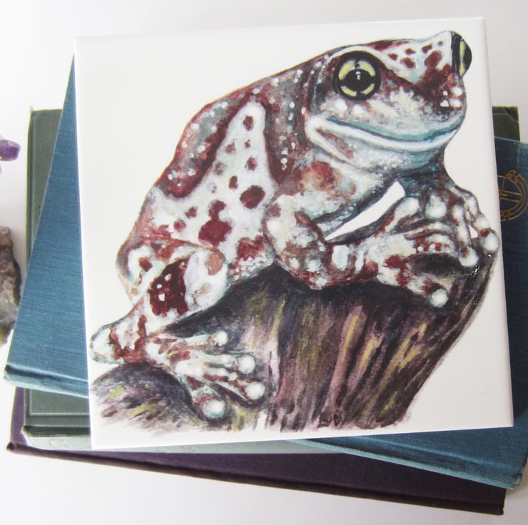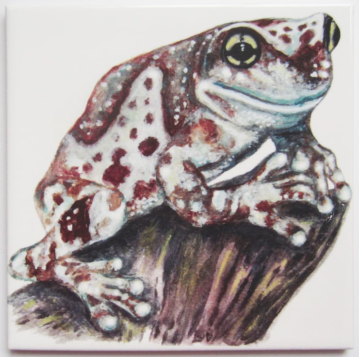 This tile is inspired by the 'Amazon Milk Frog' or 'Mission Golden-Eyed Tree Frog' and is part of my 'Animalia' design range