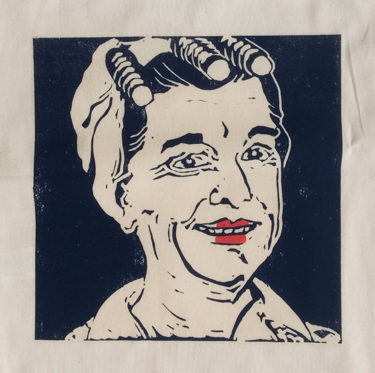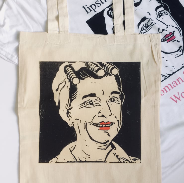 “What does your lipstick taste of?” “Woman Stanley, Woman!” This eco tote bag features one of Coronation Street’s most missed characters, Hilda Ogden. Based on an original linoprint, Hilda looks resplendant on this tote, complete with glittery pinky-red lipstick! The bag is 100% unbleached cotton measuring 37cm x 42cm with long handles and is printed in Manchester. It will be sent carefully wrapped in tissue and would make a lovely gift for any proper Corrie fan x (Check out my ‘Vera’ tote too!)