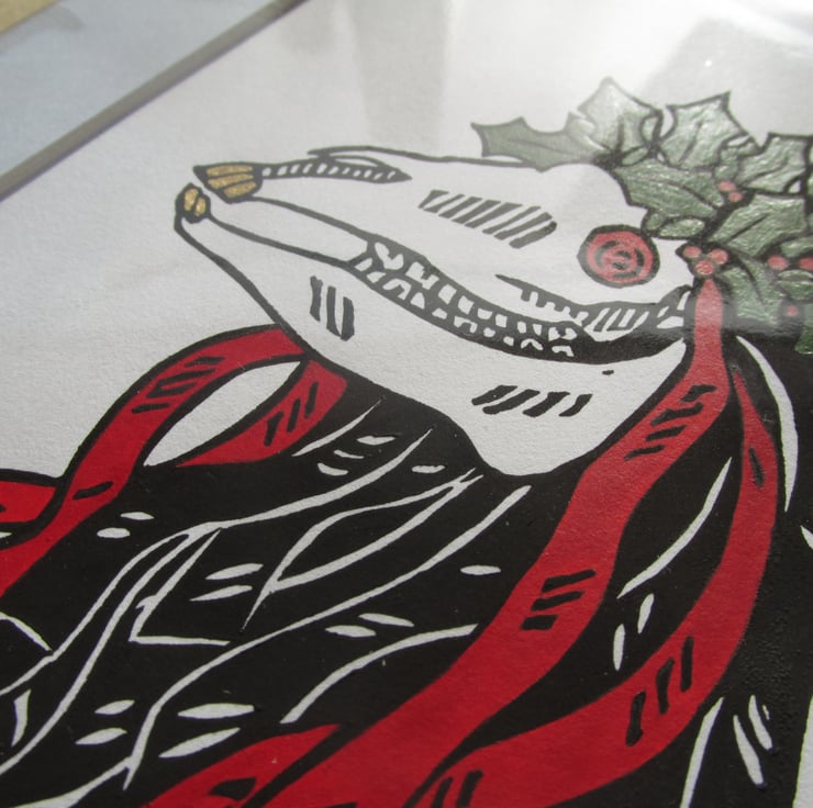 Water-based black, matte ink print on white 140gsm paper, hand-hand pressed with a spoon and touched up by hand also to give it a consistent tone all over, and hand coloured with acrylic ink.