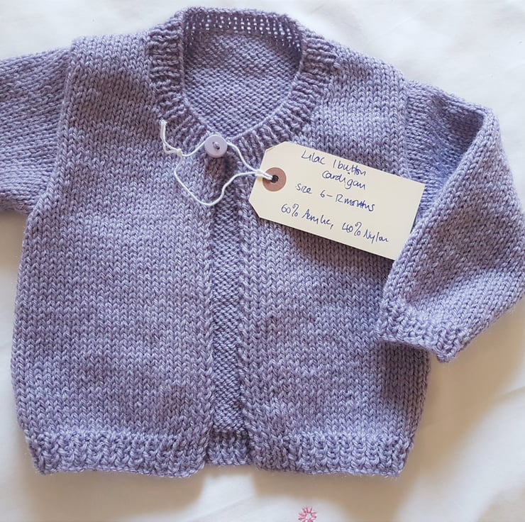 It has long sleeves, a round neck and fastens with one little lilac button. A plain but classic cardigan. It would look lovely over a pretty spring or summer dress.