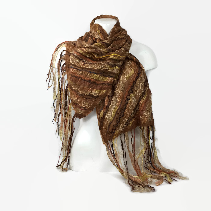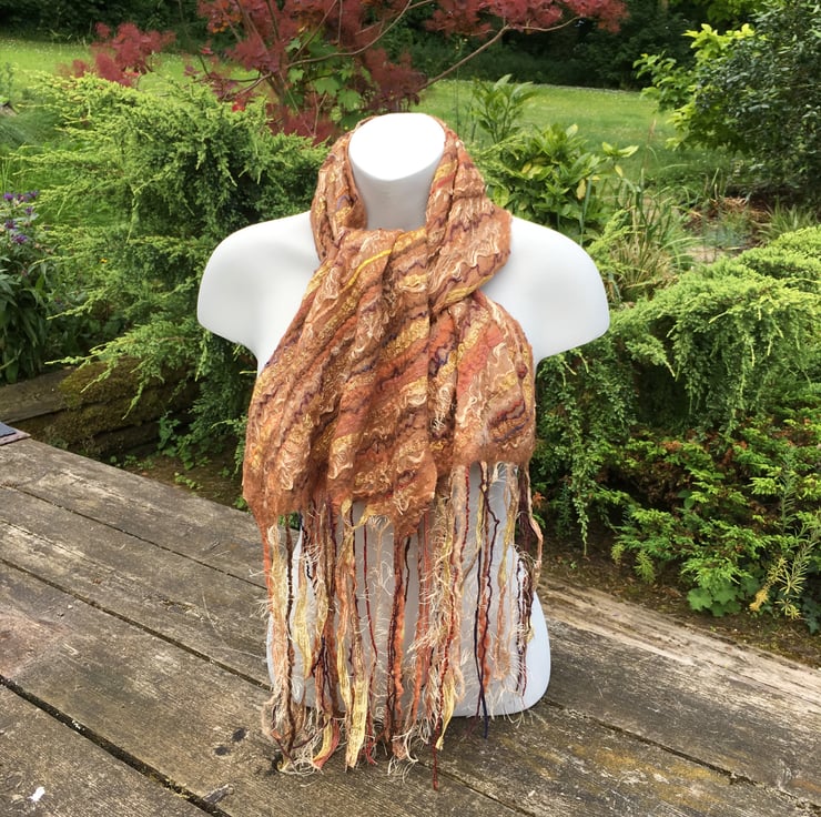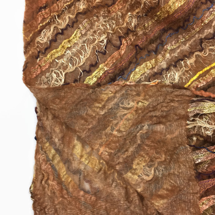 This scarf is made using a beige silk chiffon base fabric. A very fine layer of beige merino wool fibres have been laid over both sides and surface embellishment using various fancy yarns and threads in different shades of brown have been added in a diagonal strip pattern. The scarf has then been nuno felted, a process that results in the woollen fibres penetrating the silk fabric and binding with it whilst also trapping the yarn threads in place. Included in the embellishment is some glitter ribbon yarn which gives the scarf some extra sparkle. The yarn threads have been left long at the ends of the scarf to create a multi textural tassel. The embellishment has been added to one side of the scarf only with the reverse side felted with merino wool but left plain.