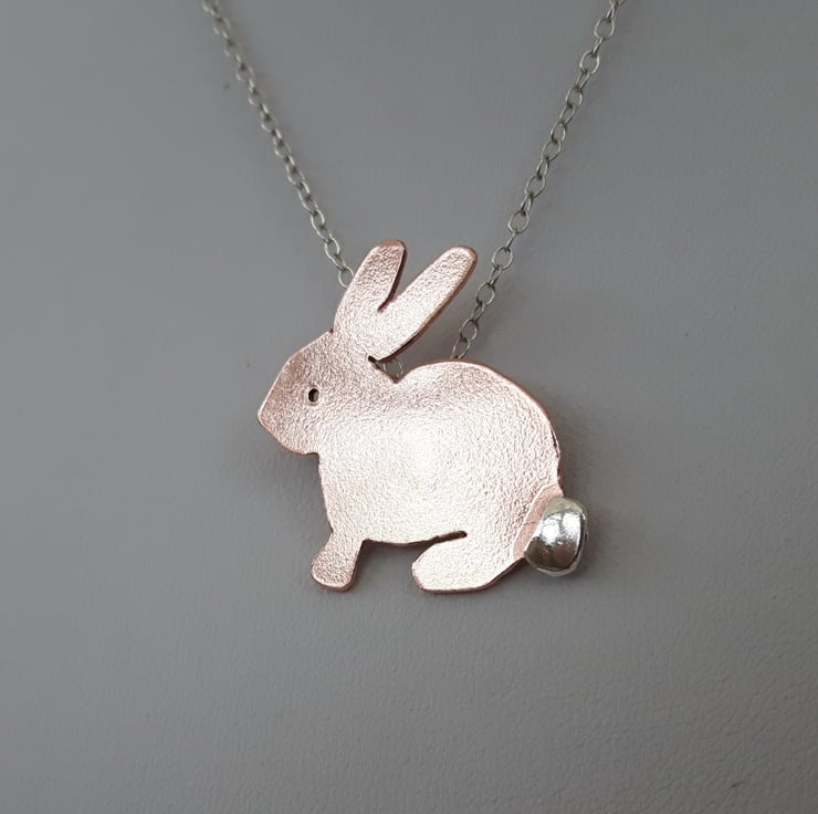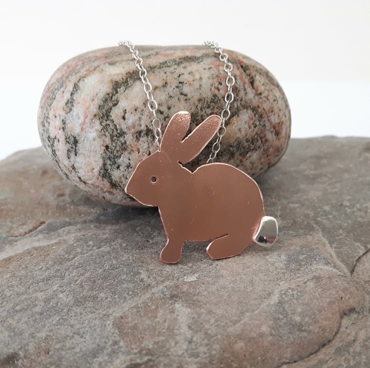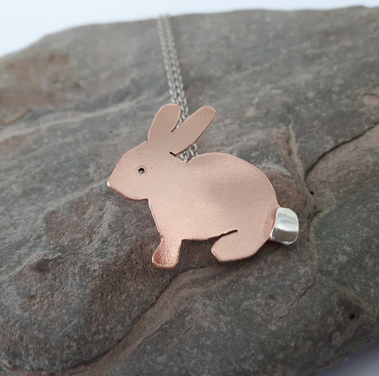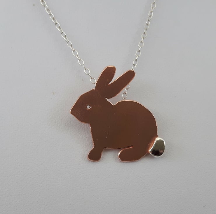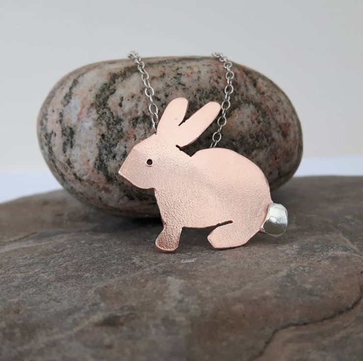 A perfect Easter gift for the bunny-lover in your family! I have cut the rabbit shape by hand from copper sheet, drilled a hole for the eye and soldered on a sterling silver tail for contrast. There is also a silver bail at the back for attachment to the chain. A sterling silver trace chain will be supplied with the pendant. The metal has been tumble-polished to a bright shine. I can leave the copper in its natural state as shown, or oxidise it to a darker bronze colour and use Renaissance wax to preserve the patina. Please add a note to your order to let me know which finish you prefer. Your pendant will be packaged in a smart gift box and sent to you by Royal Mail first class post.