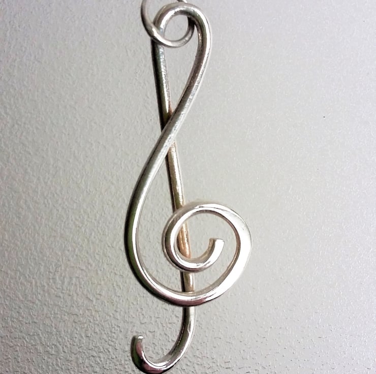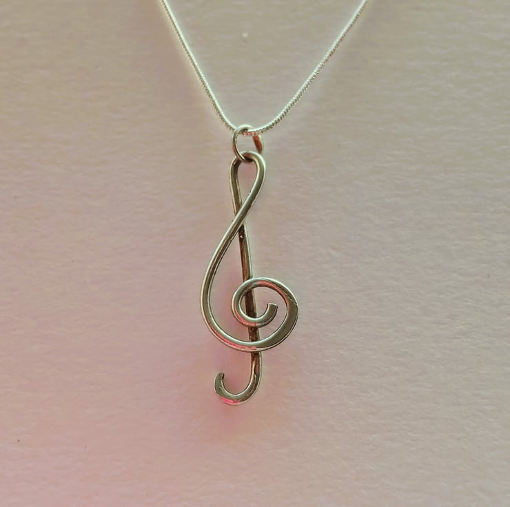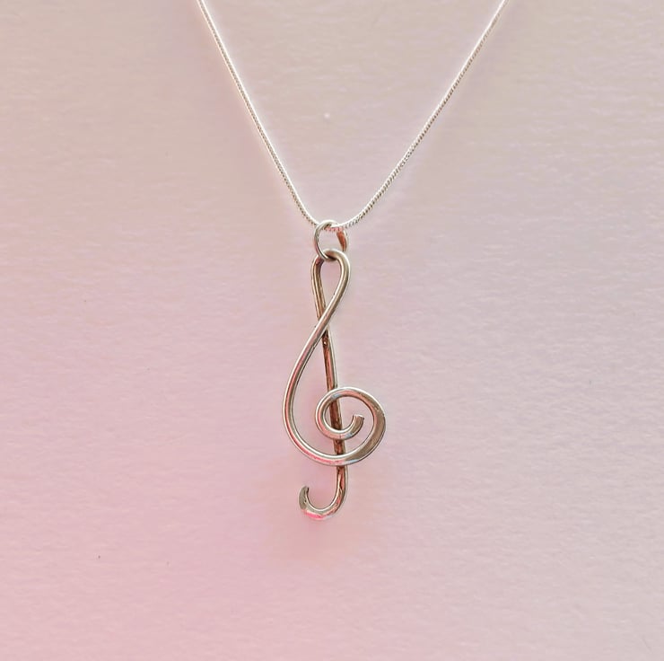 A sterling silver treble clef, measuring 38mm in length, it comes complete with an 18” silver plated snake chain with a soldered sterling silver jump ring and is supplied with a little organza pouch.