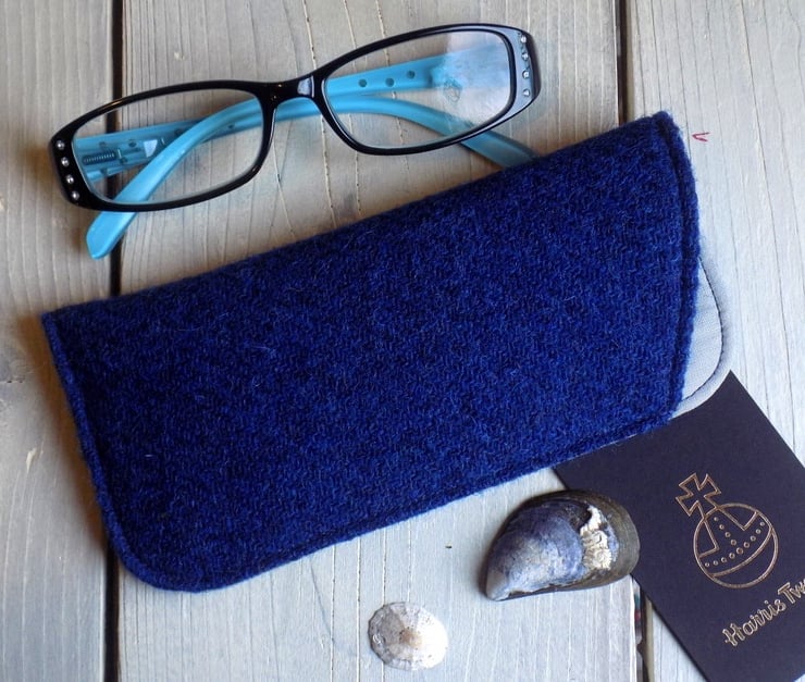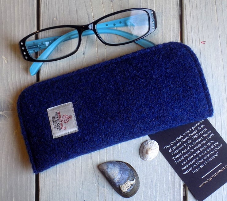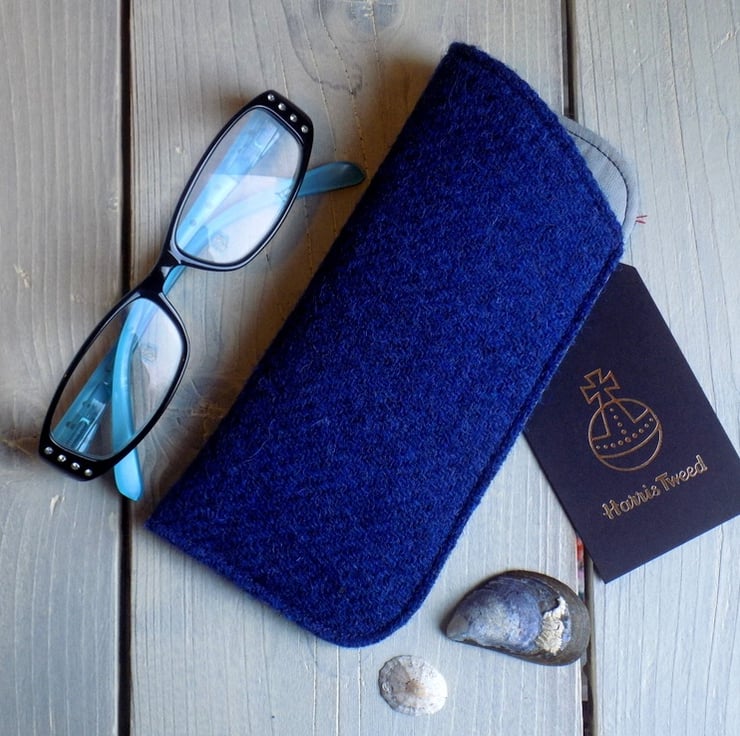 Generously proportioned Harris Tweed glasses case in deep blue plain weave. Lighter than navy, a strong, deep cobalt blue.