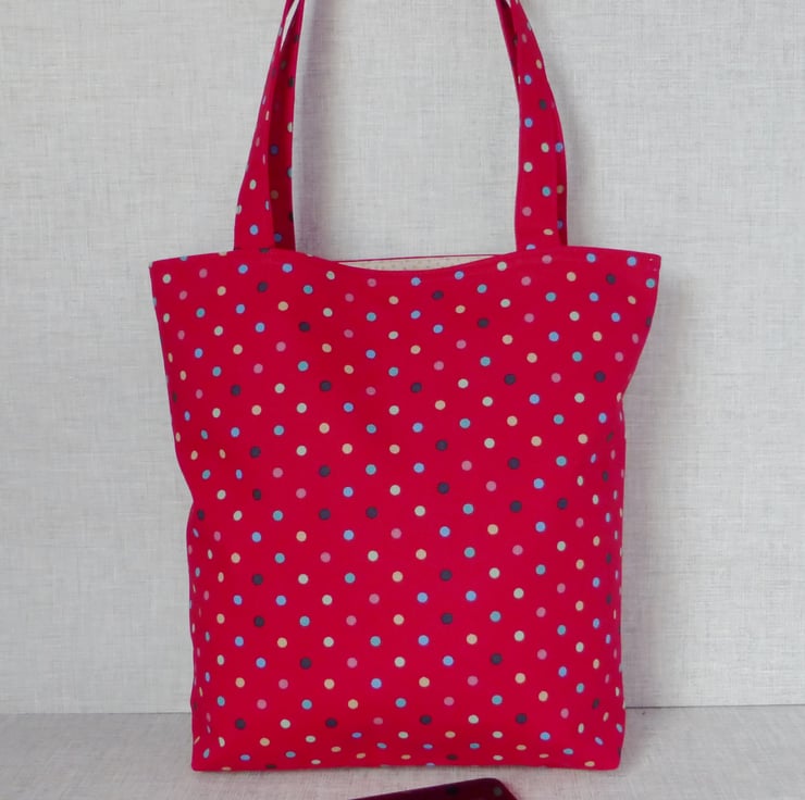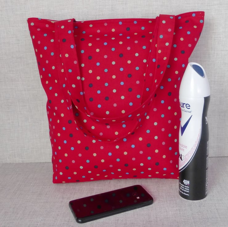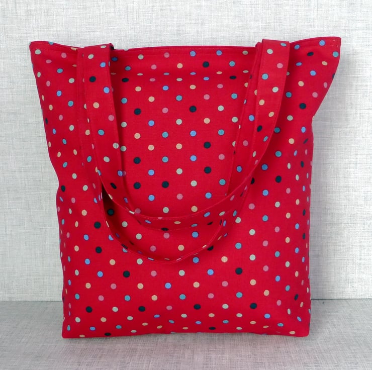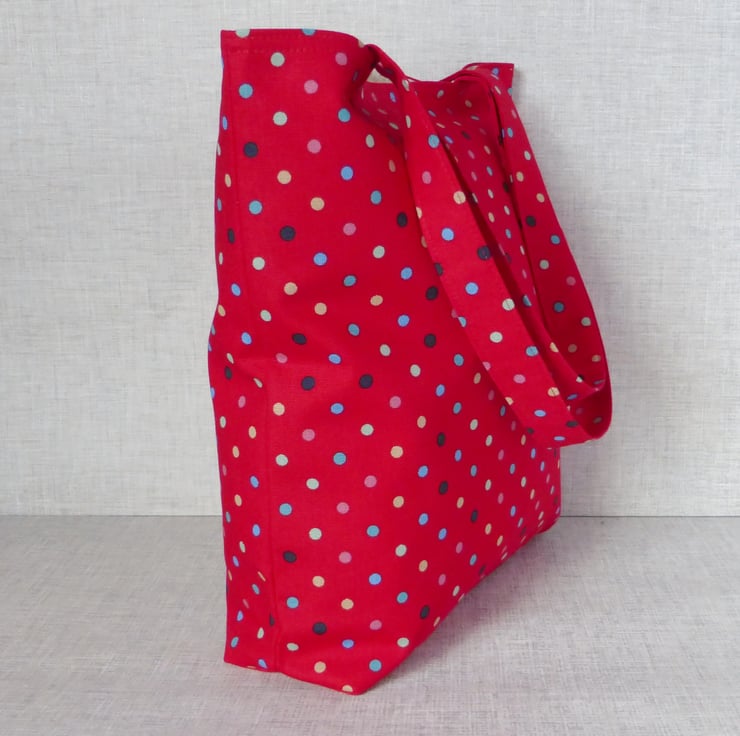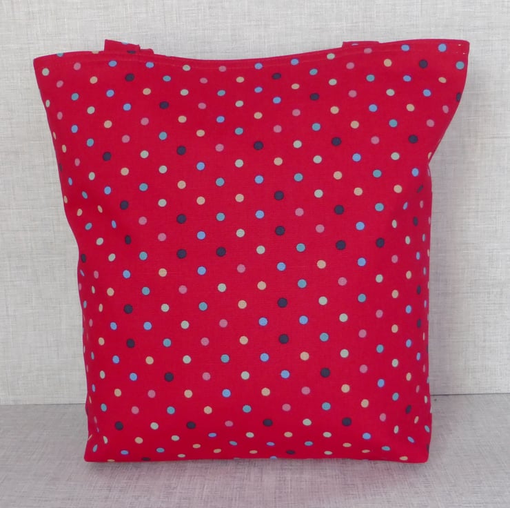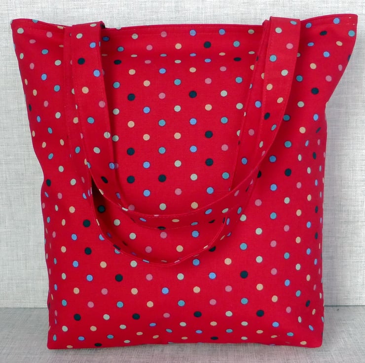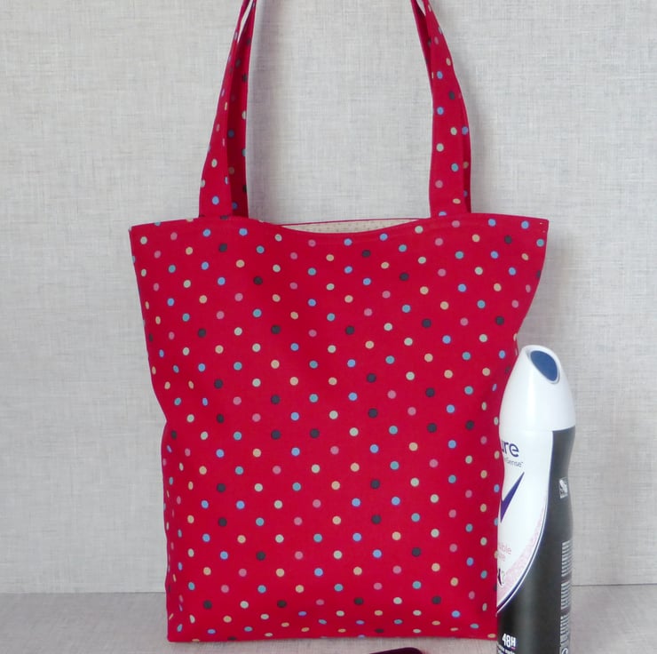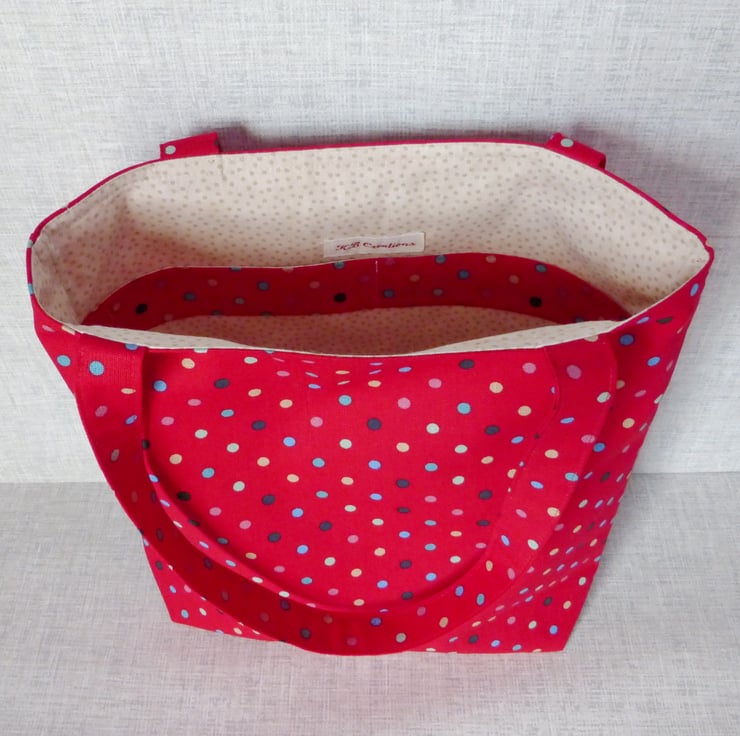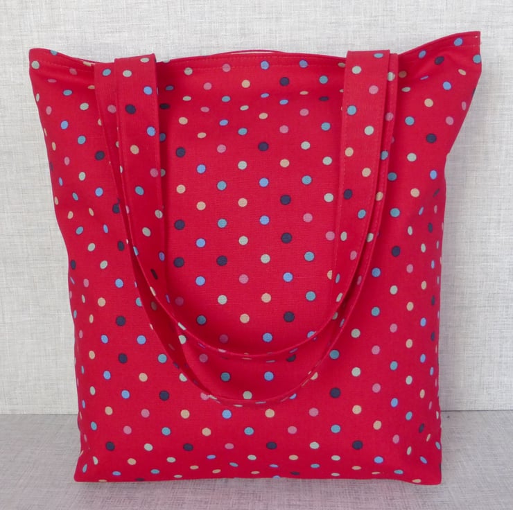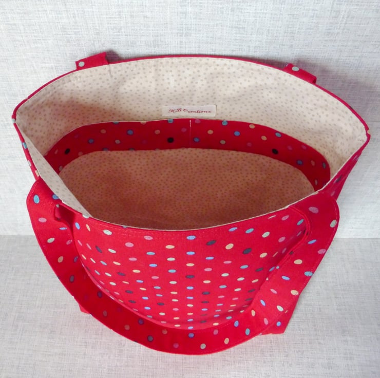 A medium sized strong tote bag/shopping bag made from cotton canvas fabric with spots in various colours on a red background. The lining is a sandy coloured, mottled cotton fabric.Inside the bag are 2 slip pockets, ideal for you shopping list, phone, keys etc.