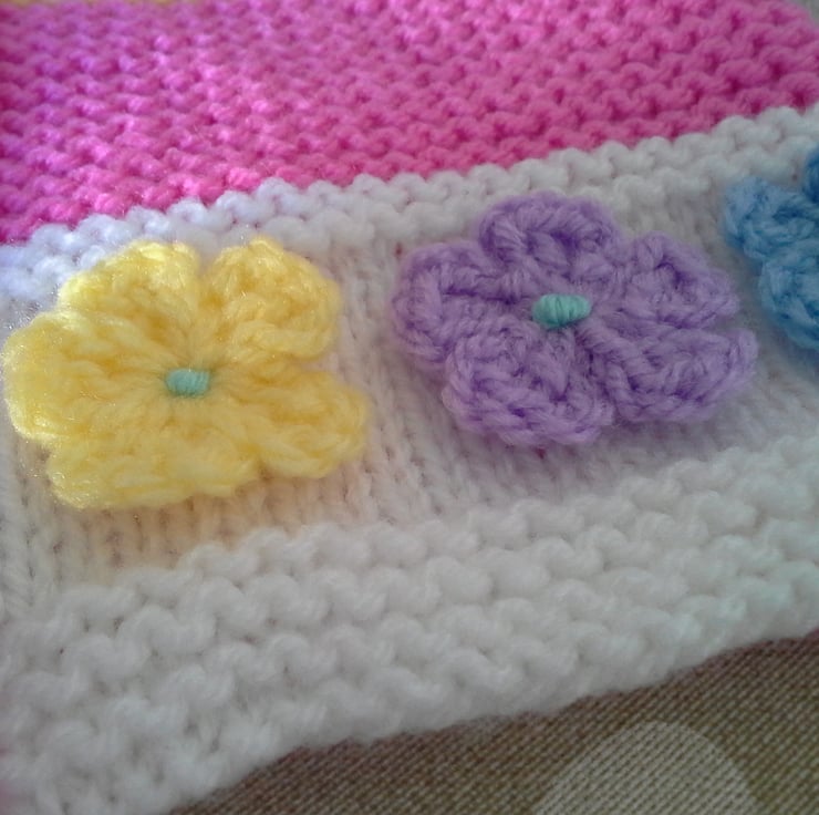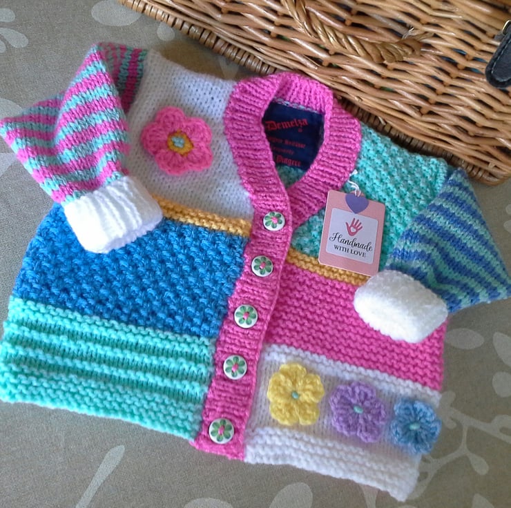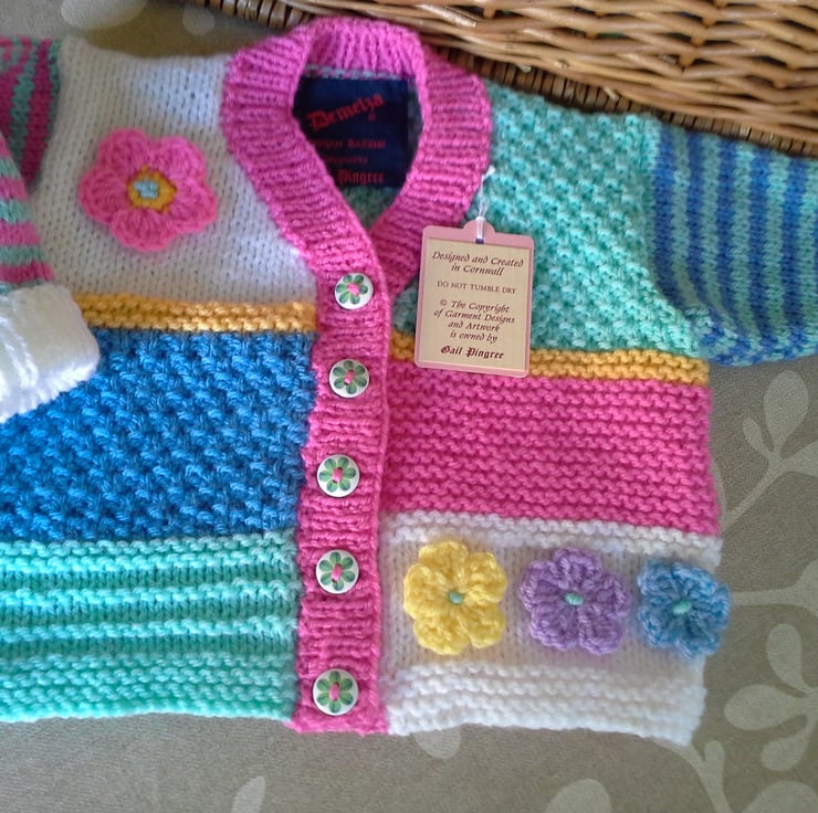 A very sweet practical baby girls cardigan/jacket designed and hand knitted using quality branded machine washable British and French manufactured yarns. This item would make an ideal newborn gift for any mother whom only appreciates designer baby clothes which have not been mass produced by the thousands. It's versatility allows it to be worn as a warm cardigan or jacket for those nippy spring days or summer evenings. The buttons are made from genuine wood with a delicate flower design on them. The crocheted flowers have also been hand made with hand knotted stitches in the centres.