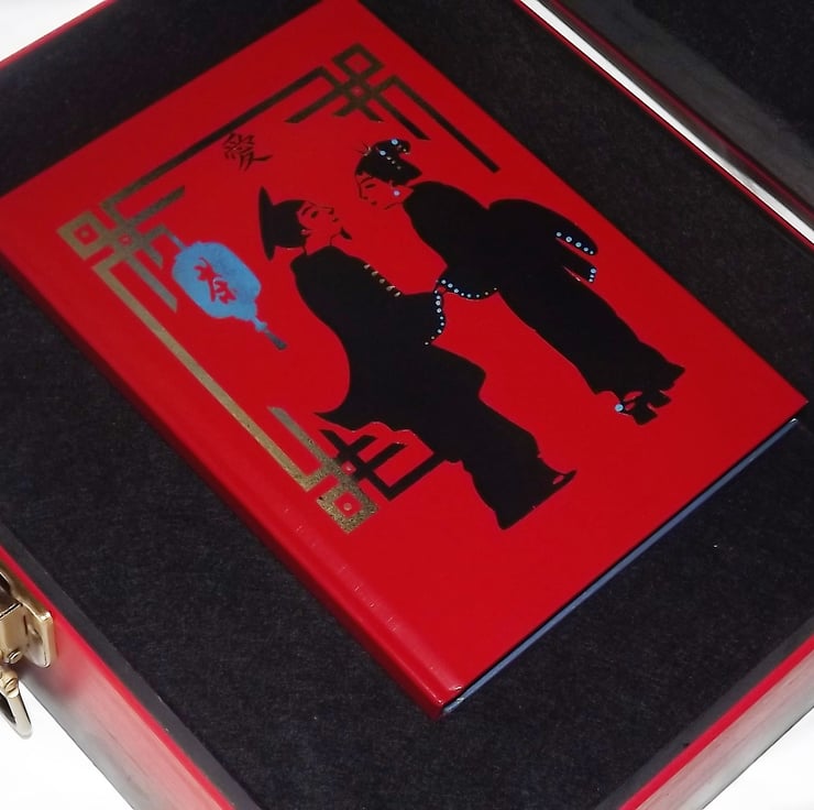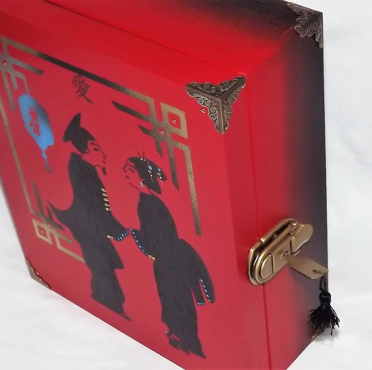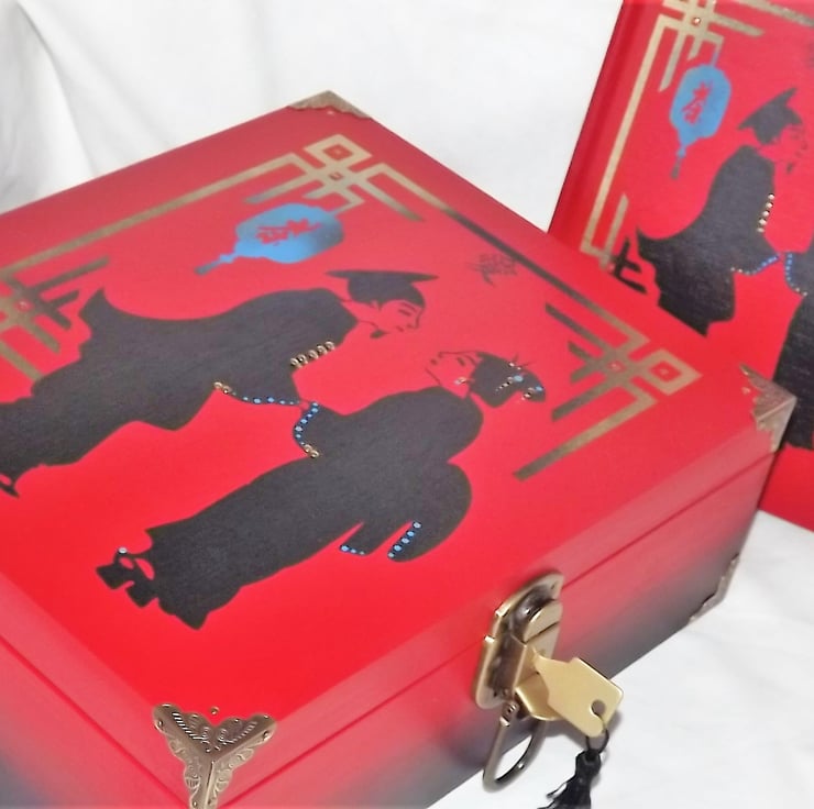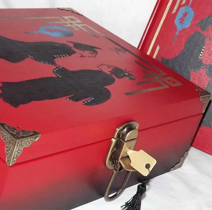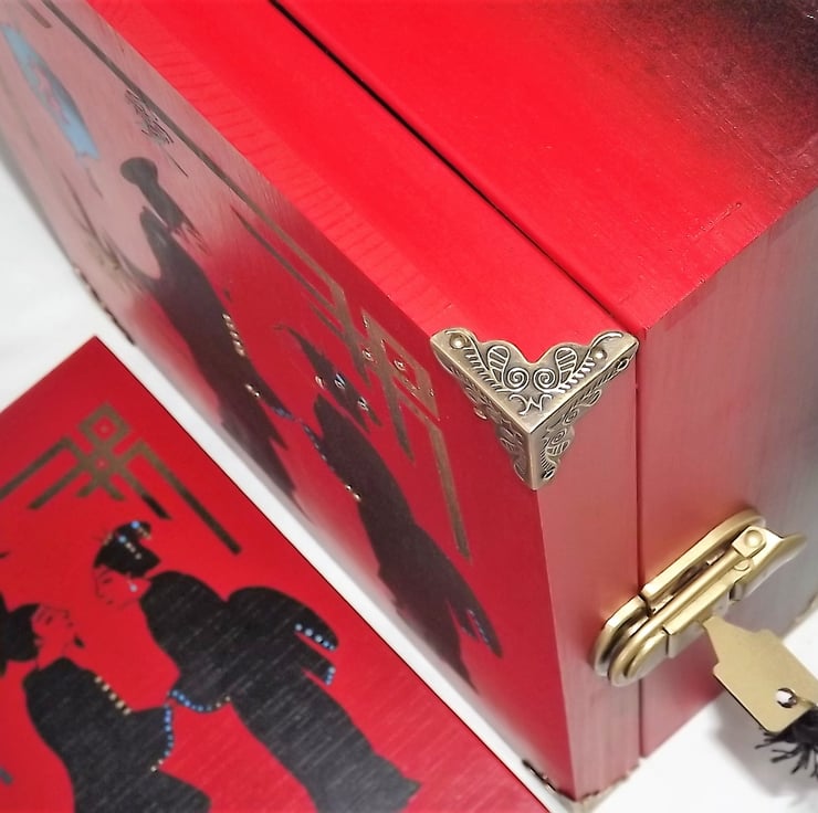 This is a large wooden lockable storage box Set is a matt red with black & gold coloured graphics depicting a Geisha & The Scholar.